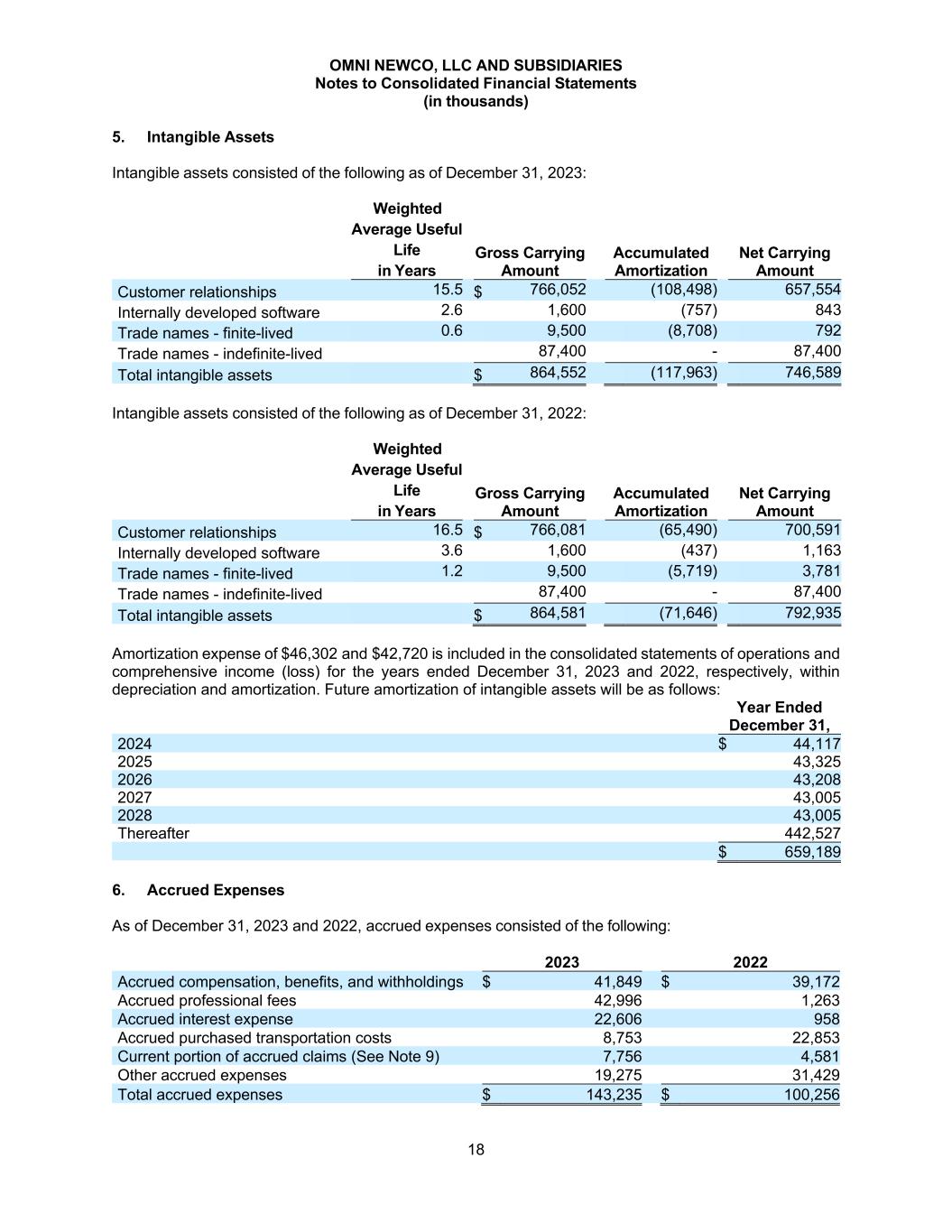 OMNI NEWCO, LLC AND SUBSIDIARIES Notes to Consolidated Financial Statements (in thousands) 18 5. Intangible Assets Intangible assets consisted of the following as of December 31, 2023: Weighted Average Useful Life in Years Gross Carrying Amount Accumulated Amortization Net Carrying Amount Customer relationships 15.5 $ 766,052 (108,498) 657,554 Internally developed software 2.6 1,600 (757) 843 Trade names - finite-lived 0.6 9,500 (8,708) 792 Trade names - indefinite-lived 87,400 - 87,400 Total intangible assets $ 864,552 (117,963) 746,589 Intangible assets consisted of the following as of December 31, 2022: Weighted Average Useful Life in Years Gross Carrying Amount Accumulated Amortization Net Carrying Amount Customer relationships 16.5 $ 766,081 (65,490) 700,591 Internally developed software 3.6 1,600 (437) 1,163 Trade names - finite-lived 1.2 9,500 (5,719) 3,781 Trade names - indefinite-lived 87,400 - 87,400 Total intangible assets $ 864,581 (71,646) 792,935 Amortization expense of $46,302 and $42,720 is included in the consolidated statements of operations and comprehensive income (loss) for the years ended December 31, 2023 and 2022, respectively, within depreciation and amortization. Future amortization of intangible assets will be as follows: Year Ended December 31, 2024 $ 44,117 2025 43,325 2026 43,208 2027 43,005 2028 43,005 Thereafter 442,527 $ 659,189 6. Accrued Expenses As of December 31, 2023 and 2022, accrued expenses consisted of the following: 2023 2022 Accrued compensation, benefits, and withholdings $ 41,849 $ 39,172 Accrued professional fees 42,996 1,263 Accrued interest expense 22,606 958 Accrued purchased transportation costs 8,753 22,853 Current portion of accrued claims (See Note 9) 7,756 4,581 Other accrued expenses 19,275 31,429 Total accrued expenses $ 143,235 $ 100,256