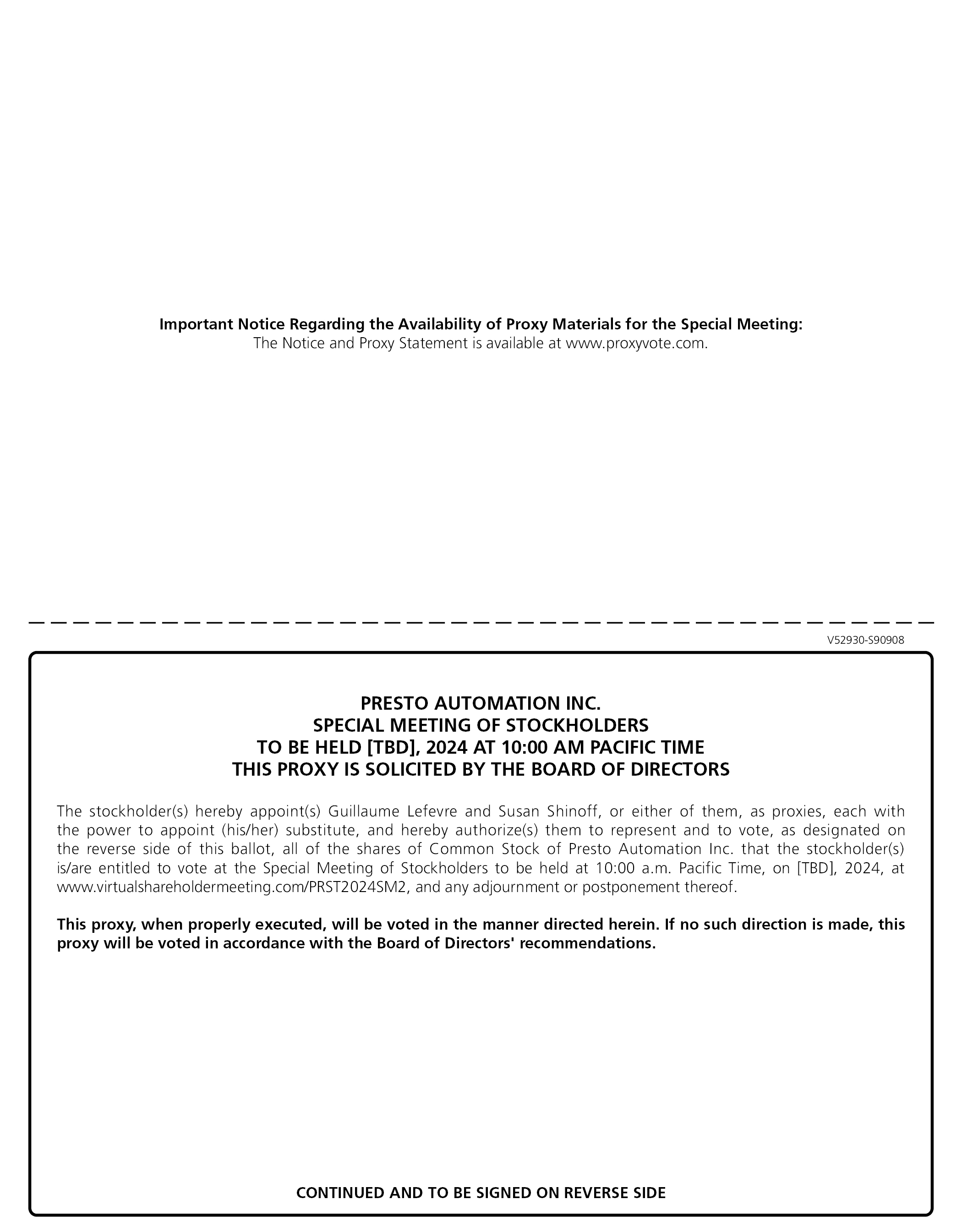 Important Notice Regarding the Availability of Proxy Materials for the Special Meeting: The Notice and Proxy Statement is available at www.proxyvote.com. V52930-S90908 PRESTO AUTOMATION INC. SPECIAL MEETING OF STOCKHOLDERS TO BE HELD [TBD], 2024 AT 10:00 AM PACIFIC TIME THIS PROXY IS SOLICITED BY THE BOARD OF DIRECTORS The stockholder(s) hereby appoint(s) Guillaume Lefevre and Susan Shinoff, or either of them, as proxies, each with the power to appoint (his/her) substitute, and hereby authorize(s) them to represent and to vote, as designated on the reverse side of this ballot, all of the shares of Common Stock of Presto Automation Inc. that the stockholder(s) is/are entitled to vote at the Special Meeting of Stockholders to be held at 10:00 a.m. Pacific Time, on [TBD], 2024, at www.virtualshareholdermeeting.com/PRST2024SM2, and any adjournment or postponement thereof. This proxy, when properly executed, will be voted in the manner directed herein. If no such direction is made, this proxy will be voted in accordance with the Board of Directors’ recommendations. CONTINUED AND TO BE SIGNED ON REVERSE SIDE