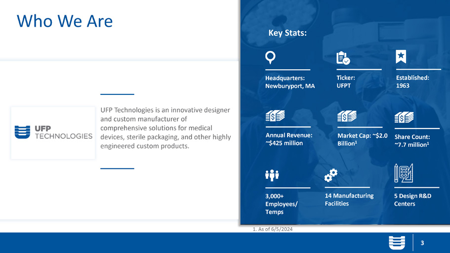Who We Are UFP Technologies is an innovative designer and custom manufacturer of comprehensive solutions for medical devices, sterile packaging, and other highly engineered custom products. 3 Ticker: UFPT Headquarters: Newburyport, MA Annual Revenue: ~$425 million 3,000+ Employees/ Temps Established: 1963 14 Manufacturing Facilities Key Stats: 5 Design R&D Centers Market Cap: ~$2.0 Billion 1 Share Count: ~7.7 million 1 1. As of 6/5/2024