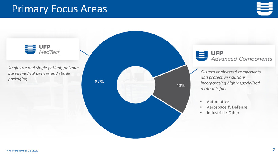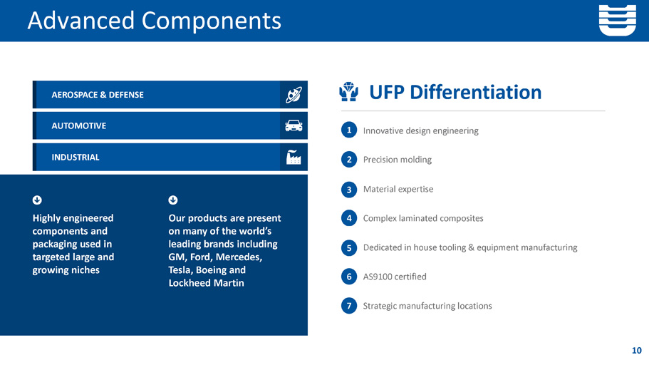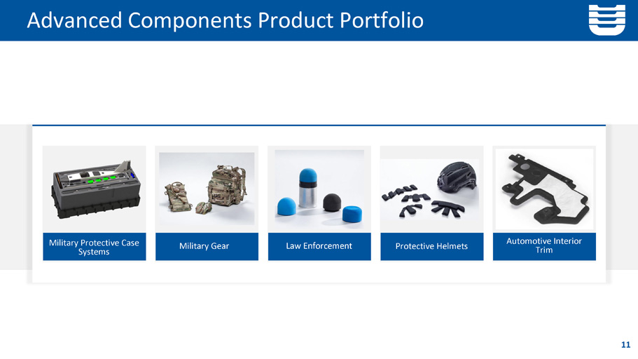 Advanced Components 10 INDUSTRIAL AUTOMOTIVE AEROSPACE & DEFENSE Highly engineered components and packaging used in targeted large and growing niches Our products are present on many of the world’s leading brands including GM, Ford, Mercedes, Tesla, Boeing and Lockheed Martin UFP Differentiation Precision molding Innovative design engineering Material expertise Complex laminated composites Dedicated in house tooling & equipment manufacturing AS9100 certified Strategic manufacturing locations 1 2 3 4 5 6 7