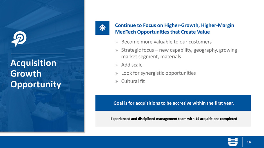 13 Organic Growth Opportunity Focus on high growth niche segments (MedTech – approximately 87% of revenue and growing) » Single - use, single - patient » Customer funded development Market to our sweet spot and differentiated capabilities » Leverage technology differentiation » Engineering resources » Exclusive access to specialty materials » Scale (footprint, clean room manufacturing) Expand business with existing customers » Offer complementary products and services » Additional value - add services