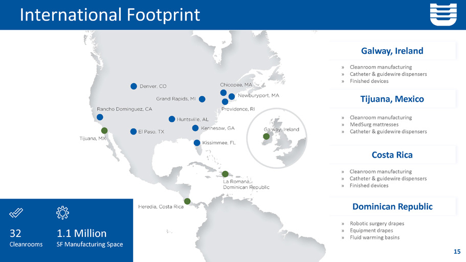 International Footprint 15 Galway, Ireland » Cleanroom manufacturing » Catheter & guidewire dispensers » Finished devices Tijuana, Mexico » Cleanroom manufacturing » MedSurg mattresses » Catheter & guidewire dispensers Costa Rica » Cleanroom manufacturing » Catheter & guidewire dispensers » Finished devices Dominican Republic » Robotic surgery drapes » Equipment drapes » Fluid warming basins 1.1 Million SF Manufacturing Space 32 Cleanrooms