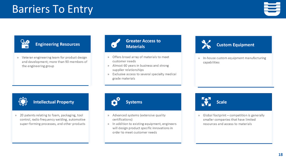 Barriers To Entry » Advanced systems (extensive quality certifications) » In addition to existing equipment, engineers will design product specific innovations in order to meet customer needs Systems » In - house custom equipment manufacturing capabilities Custom Equipment » 20 patents relating to foam, packaging, tool control, radio frequency welding, automotive super - forming processes, and other products Intellectual Property » Global footprint – competition is generally smaller companies that have limited resources and access to materials Scale » Veteran engineering team for product design and development; more than 90 members of the engineering group Engineering Resources » Offers broad array of materials to meet customer needs » Almost 60 years in business and strong supplier relationships » Exclusive access to several specialty medical grade materials Greater Access to Materials 18