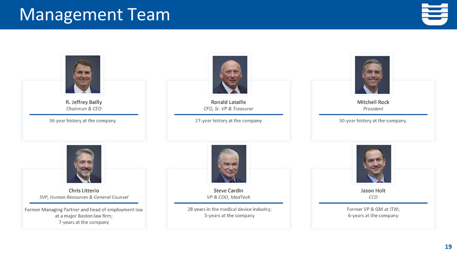Management Team 19 Chris Litterio SVP, Human Resources & General Counsel Former Managing Partner and head of employment law at a major Boston law firm; 7 - years at the company Steve Cardin VP & COO, MedTech 28 years in the medical device industry; 5 - years at the company Jason Holt CCO Former VP & GM at ITW; 6 - years at the company R. Jeffrey Bailly Chairman & CEO 36 - year history at the company Ronald Lataille CFO, Sr. VP & Treasurer 27 - year history at the company Mitchell Rock President 30 - year history at the company.
