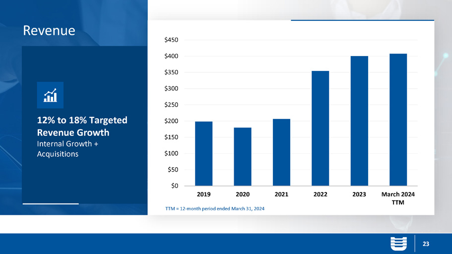 12% to 18 % Targeted Revenue Growth Internal Growth + Acquisitions $0 $50 $100 $150 $200 $250 $300 $350 $400 $450 2019 2020 2021 2022 2023 March 2024 TTM 23 Revenue TTM = 12 - month period ended March 31, 2024