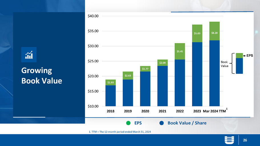 Growing Book Value 26 $1.93 $2.63 $1.77 $2.09 $5.45 $5.83 $6.20 $10.00 $15.00 $20.00 $25.00 $30.00 $35.00 $40.00 2018 2019 2020 2021 2022 2023 Mar 2024 TTM * EPS Book Value / Share Book Value EPS 1 1. TTM = The 12 - month period ended March 31, 2024
