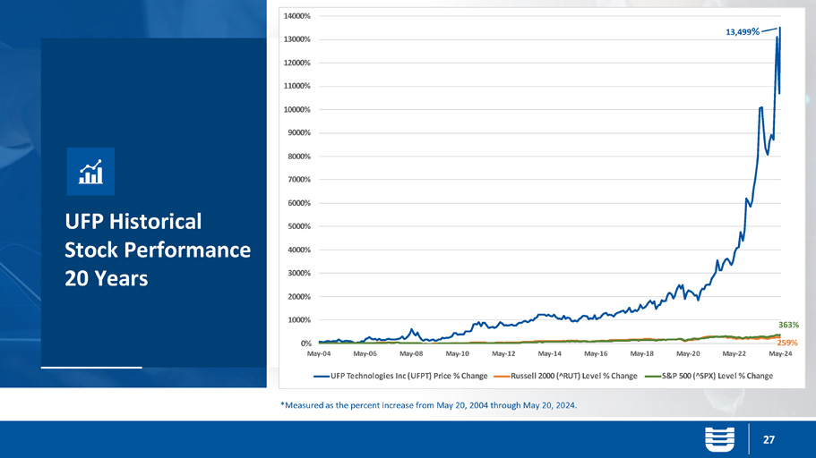 UFP Historical Stock Performance 20 Years 27 *Measured as the percent increase from May 20, 2004 through May 20, 2024. Ϭ й ϭϬϬϬ й ϮϬϬϬ й ϯϬϬϬ й ϰϬϬϬ й ϱϬϬϬ й ϲϬϬϬ й ϳϬϬϬ й ϴϬϬϬ й ϵϬϬϬ й ϭϬϬϬϬ й ϭϭϬϬϬ й ϭϮϬϬϬ й ϭϯϬϬϬ й ϭϰϬϬϬ й DĂLJ Ͳ Ϭϰ DĂLJ Ͳ Ϭϲ DĂLJ Ͳ Ϭϴ DĂLJ Ͳ ϭϬ DĂLJ Ͳ ϭϮ DĂLJ Ͳ ϭϰ DĂLJ Ͳ ϭϲ DĂLJ Ͳ ϭϴ DĂLJ Ͳ ϮϬ DĂLJ Ͳ ϮϮ DĂLJ Ͳ Ϯϰ h&WdĞĐŚŶŽůŽŐŝĞƐ/ŶĐ ; h&Wd Ϳ WƌŝĐĞ й ŚĂŶŐĞ ZƵƐƐĞůů ϮϬϬϬ ; Δ Zhd Ϳ >ĞǀĞů й ŚĂŶŐĞ ^ Θ W ϱϬϬ ; Δ ^Wy Ϳ >ĞǀĞů й ŚĂŶŐĞ Ϯϱϵ й ϯϲϯ й ϭϯ ͕ ϰϵϵ й