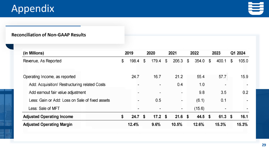 Appendix Reconciliation of Non - GAAP Results 29 (in Millions) 2019 2020 2021 2022 2023 Q1 2024 Revenue, As Reported $ 198.4 $ 179.4 $ 206.3 $ 354.0 $ 400.1 $ 105.0 Operating Income, as reported 24.7 16.7 21.2 55.4 57.7 15.9 Add: Acquisition/ Restructuring related Costs - - 0.4 1.0 - - Add earnout fair value adjustment - - - 9.8 3.5 0.2 Less: Gain or Add: Loss on Sale of fixed assets - 0.5 - (6.1) 0.1 - Less: Sale of MFT - - - (15.6) - - Adjusted Operating Income $ 24.7 $ 17.2 $ 21.6 $ 44.5 $ 61.3 $ 16.1 Adjusted Operating Margin 12.4% 9.6% 10.5% 12.6% 15.3% 15.3%