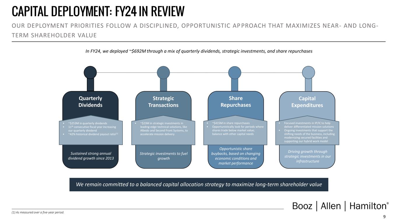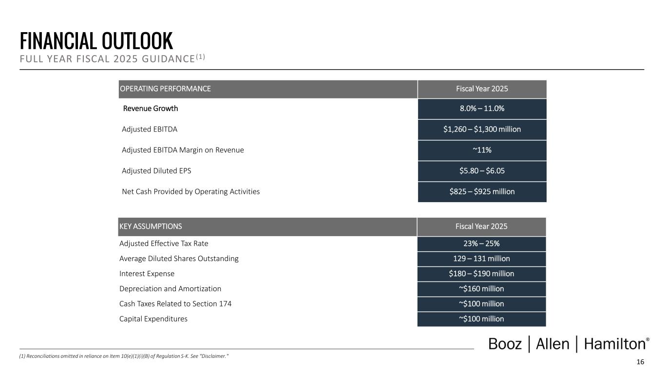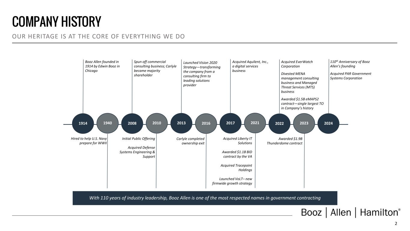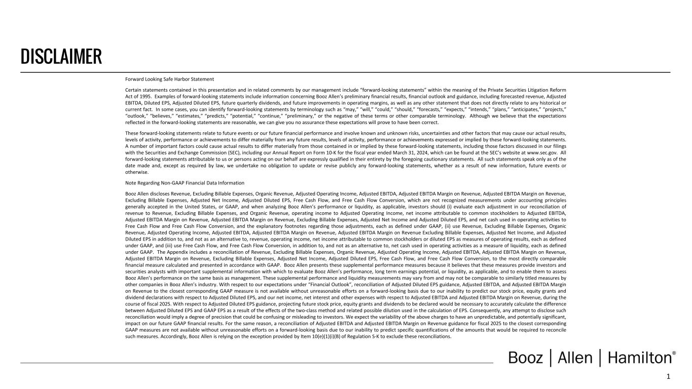 1 DISCLAIMER Forward Looking Safe Harbor Statement Certain statements contained in this presentation and in related comments by our management include “forward-looking statements” within the meaning of the Private Securities Litigation Reform Act of 1995. Examples of forward-looking statements include information concerning Booz Allen’s preliminary financial results, financial outlook and guidance, including forecasted revenue, Adjusted EBITDA, Diluted EPS, Adjusted Diluted EPS, future quarterly dividends, and future improvements in operating margins, as well as any other statement that does not directly relate to any historical or current fact. In some cases, you can identify forward-looking statements by terminology such as “may,” “will,” “could,” “should,” “forecasts,” “expects,” “intends,” “plans,” “anticipates,” “projects,” “outlook,” “believes,” “estimates,” “predicts,” “potential,” “continue,” “preliminary,” or the negative of these terms or other comparable terminology. Although we believe that the expectations reflected in the forward-looking statements are reasonable, we can give you no assurance these expectations will prove to have been correct. These forward-looking statements relate to future events or our future financial performance and involve known and unknown risks, uncertainties and other factors that may cause our actual results, levels of activity, performance or achievements to differ materially from any future results, levels of activity, performance or achievements expressed or implied by these forward-looking statements. A number of important factors could cause actual results to differ materially from those contained in or implied by these forward-looking statements, including those factors discussed in our filings with the Securities and Exchange Commission (SEC), including our Annual Report on Form 10-K for the fiscal year ended March 31, 2024, which can be found at the SEC’s website at www.sec.gov. All forward-looking statements attributable to us or persons acting on our behalf are expressly qualified in their entirety by the foregoing cautionary statements. All such statements speak only as of the date made and, except as required by law, we undertake no obligation to update or revise publicly any forward-looking statements, whether as a result of new information, future events or otherwise. Note Regarding Non-GAAP Financial Data Information Booz Allen discloses Revenue, Excluding Billable Expenses, Organic Revenue, Adjusted Operating Income, Adjusted EBITDA, Adjusted EBITDA Margin on Revenue, Adjusted EBITDA Margin on Revenue, Excluding Billable Expenses, Adjusted Net Income, Adjusted Diluted EPS, Free Cash Flow, and Free Cash Flow Conversion, which are not recognized measurements under accounting principles generally accepted in the United States, or GAAP, and when analyzing Booz Allen’s performance or liquidity, as applicable, investors should (i) evaluate each adjustment in our reconciliation of revenue to Revenue, Excluding Billable Expenses, and Organic Revenue, operating income to Adjusted Operating Income, net income attributable to common stockholders to Adjusted EBITDA, Adjusted EBITDA Margin on Revenue, Adjusted EBITDA Margin on Revenue, Excluding Billable Expenses, Adjusted Net Income and Adjusted Diluted EPS, and net cash used in operating activities to Free Cash Flow and Free Cash Flow Conversion, and the explanatory footnotes regarding those adjustments, each as defined under GAAP, (ii) use Revenue, Excluding Billable Expenses, Organic Revenue, Adjusted Operating Income, Adjusted EBITDA, Adjusted EBITDA Margin on Revenue, Adjusted EBITDA Margin on Revenue Excluding Billable Expenses, Adjusted Net Income, and Adjusted Diluted EPS in addition to, and not as an alternative to, revenue, operating income, net income attributable to common stockholders or diluted EPS as measures of operating results, each as defined under GAAP, and (iii) use Free Cash Flow, and Free Cash Flow Conversion, in addition to, and not as an alternative to, net cash used in operating activities as a measure of liquidity, each as defined under GAAP. The Appendix includes a reconciliation of Revenue, Excluding Billable Expenses, Organic Revenue, Adjusted Operating Income, Adjusted EBITDA, Adjusted EBITDA Margin on Revenue, Adjusted EBITDA Margin on Revenue, Excluding Billable Expenses, Adjusted Net Income, Adjusted Diluted EPS, Free Cash Flow, and Free Cash Flow Conversion, to the most directly comparable financial measure calculated and presented in accordance with GAAP. Booz Allen presents these supplemental performance measures because it believes that these measures provide investors and securities analysts with important supplemental information with which to evaluate Booz Allen’s performance, long term earnings potential, or liquidity, as applicable, and to enable them to assess Booz Allen’s performance on the same basis as management. These supplemental performance and liquidity measurements may vary from and may not be comparable to similarly titled measures by other companies in Booz Allen’s industry. With respect to our expectations under “Financial Outlook”, reconciliation of Adjusted Diluted EPS guidance, Adjusted EBITDA, and Adjusted EBITDA Margin on Revenue to the closest corresponding GAAP measure is not available without unreasonable efforts on a forward-looking basis due to our inability to predict our stock price, equity grants and dividend declarations with respect to Adjusted Diluted EPS, and our net income, net interest and other expenses with respect to Adjusted EBITDA and Adjusted EBITDA Margin on Revenue, during the course of fiscal 2025. With respect to Adjusted Diluted EPS guidance, projecting future stock price, equity grants and dividends to be declared would be necessary to accurately calculate the difference between Adjusted Diluted EPS and GAAP EPS as a res