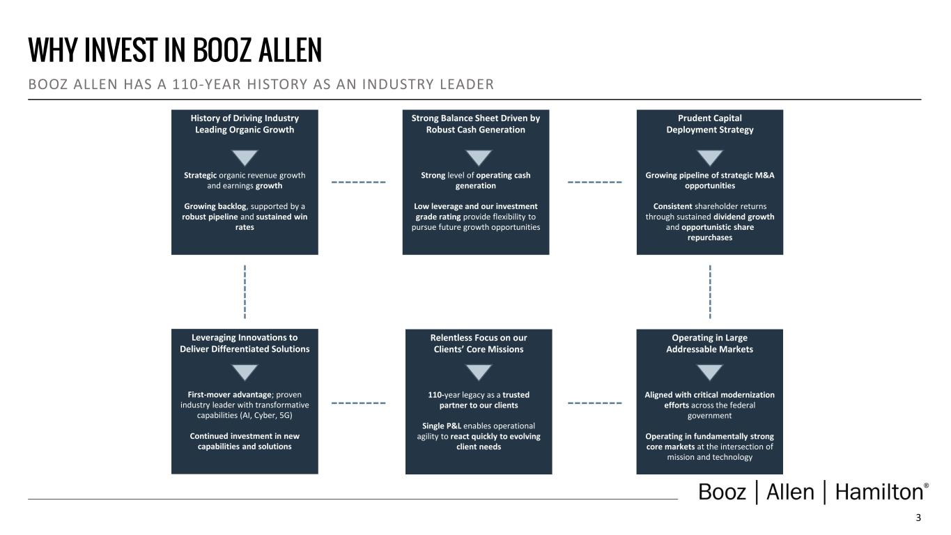 2 COMPANY HISTORY OUR HERITAGE IS AT THE CORE OF EVERYTHING WE DO 201719661914 Booz Allen founded in 1914 by Edwin Booz in Chicago With 110 years of industry leadership, Booz Allen is one of the most respected names in government contracting Hired to help U.S. Navy prepare for WWII Spun off commercial consulting business; Carlyle became majority shareholder Acquired Aquilent, Inc., a digital services business Launched Vision 2020 Strategy—transforming the company from a consulting firm to leading solutions provider 1940 2010 2013 2016 2017 Initial Public Offering Acquired Defense Systems Engineering & Support 2008 Carlyle completed ownership exit Acquired Liberty IT Solutions Awarded $1.1B BID contract by the VA Acquired Tracepoint Holdings Launched VoLT– new firmwide growth strategy 2021 Acquired EverWatch Corporation Divested MENA management consulting business and Managed Threat Services (MTS) business Awarded $1.5B eMAPS2 contract—single largest TO in Company’s history 2022 2023 Awarded $1.9B Thunderdome contract 2024 110th Anniversary of Booz Allen’s founding Acquired PAR Government Systems Corporation