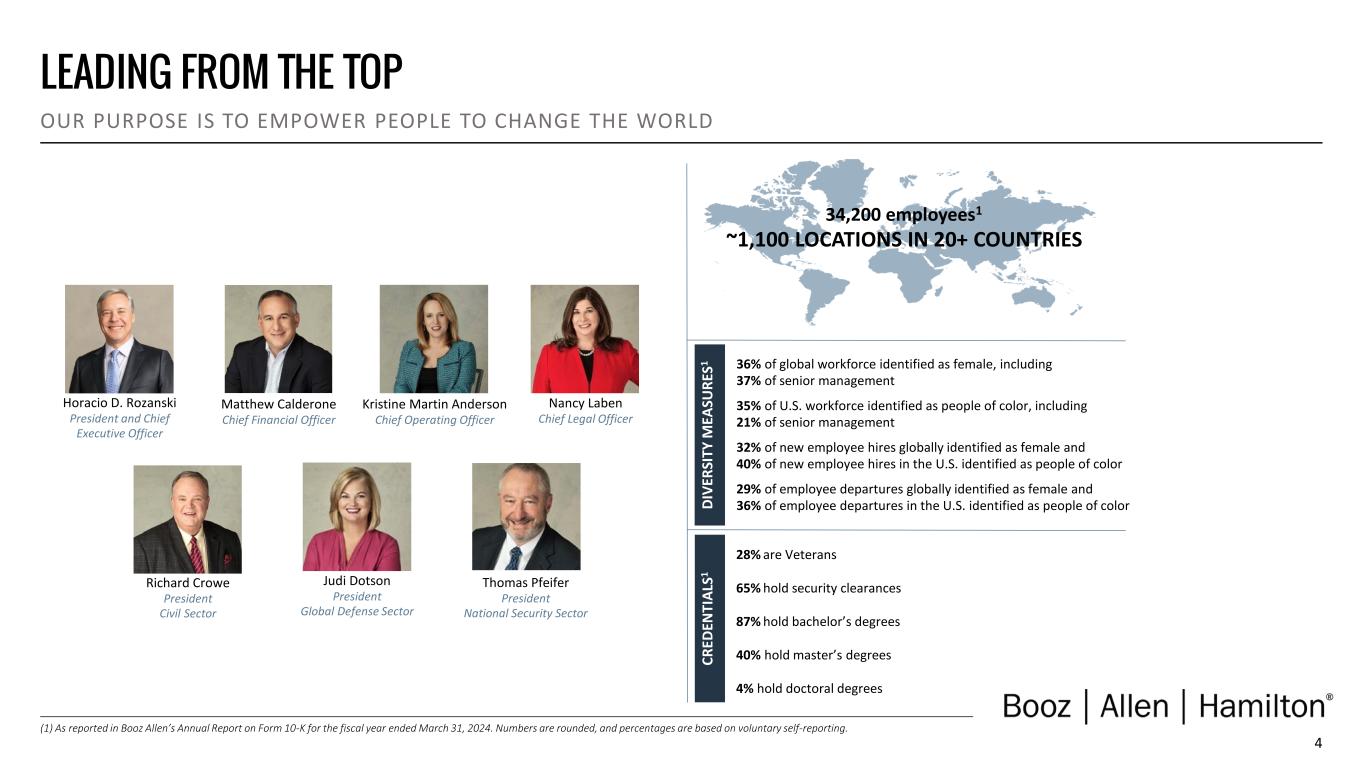 3 WHY INVEST IN BOOZ ALLEN BOOZ ALLEN HAS A 110-YEAR HISTORY AS AN INDUSTRY LEADER History of Driving Industry Leading Organic Growth Strategic organic revenue growth and earnings growth Growing backlog, supported by a robust pipeline and sustained win rates Strong Balance Sheet Driven by Robust Cash Generation Strong level of operating cash generation Low leverage and our investment grade rating provide flexibility to pursue future growth opportunities Prudent Capital Deployment Strategy Growing pipeline of strategic M&A opportunities Consistent shareholder returns through sustained dividend growth and opportunistic share repurchases Leveraging Innovations to Deliver Differentiated Solutions First-mover advantage; proven industry leader with transformative capabilities (AI, Cyber, 5G) Continued investment in new capabilities and solutions Relentless Focus on our Clients’ Core Missions 110-year legacy as a trusted partner to our clients Single P&L enables operational agility to react quickly to evolving client needs Operating in Large Addressable Markets Aligned with critical modernization efforts across the federal government Operating in fundamentally strong core markets at the intersection of mission and technology