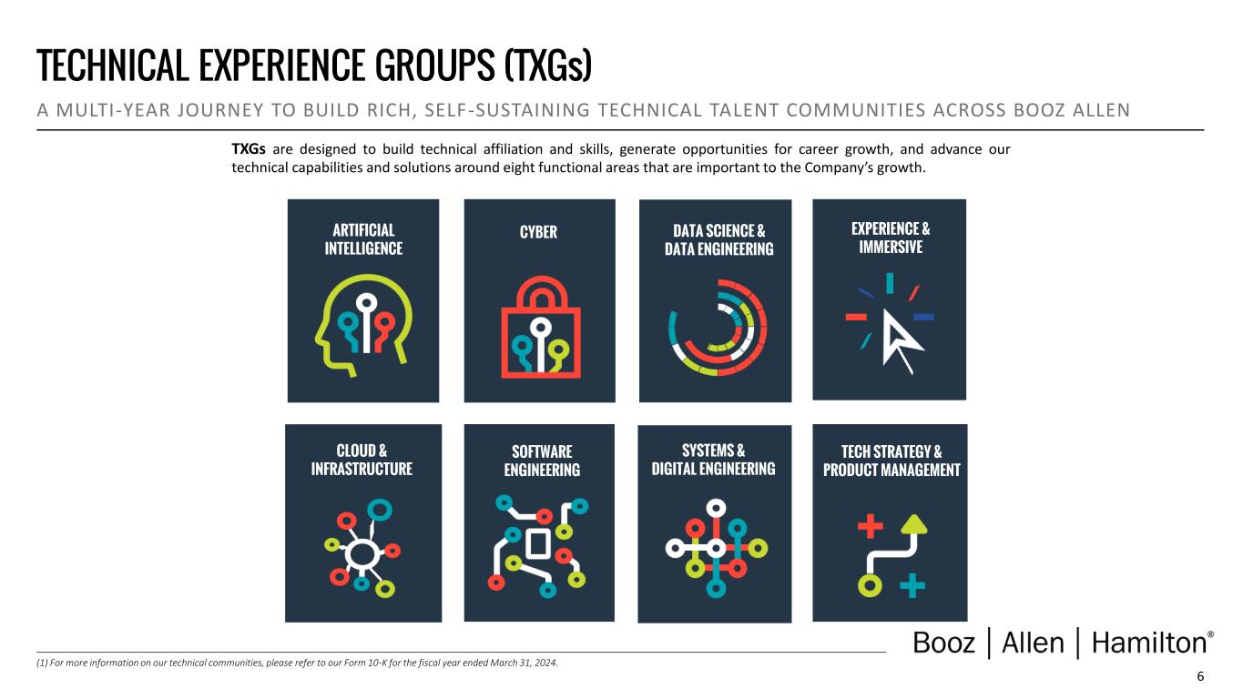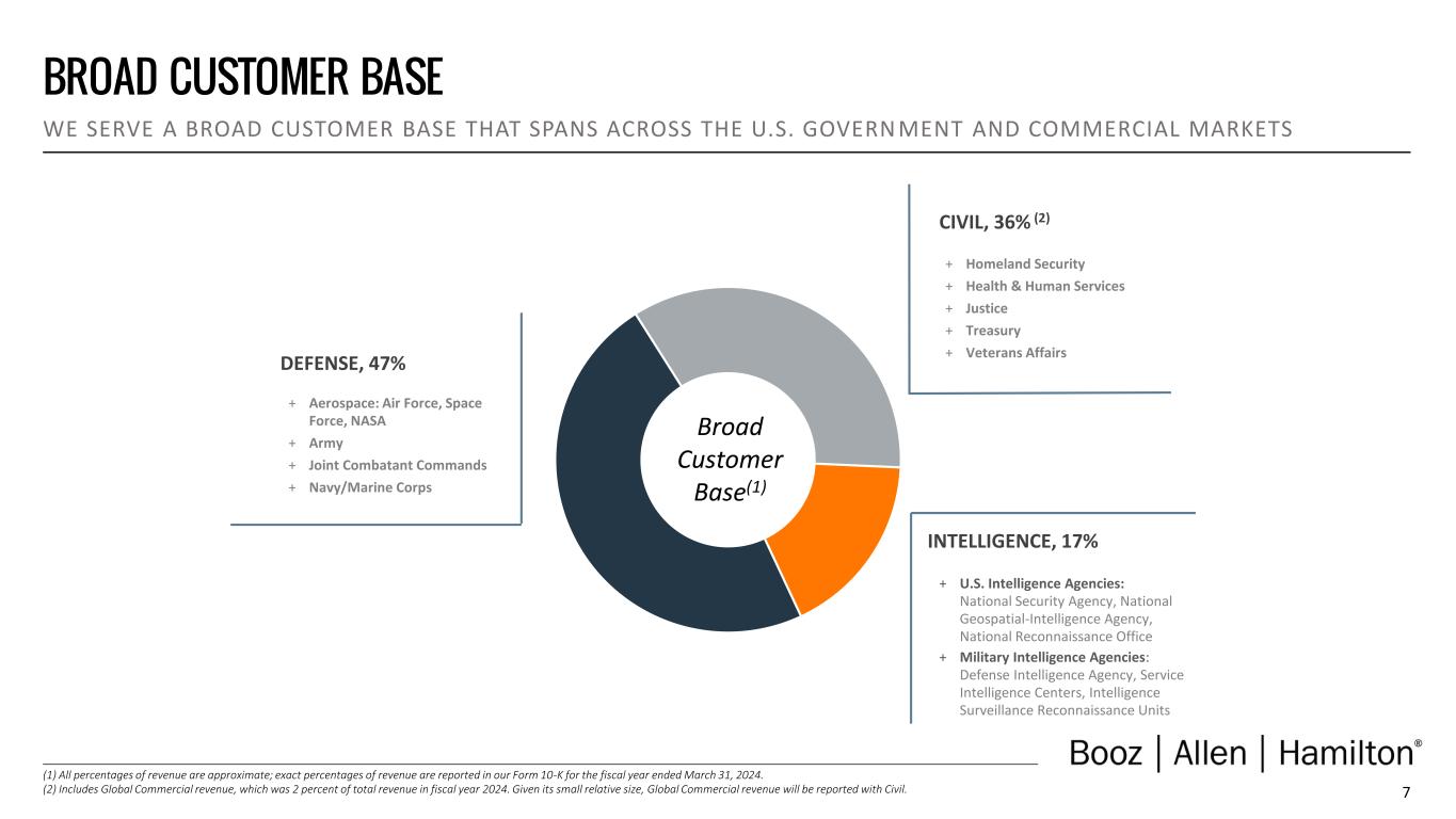 6 TECHNICAL EXPERIENCE GROUPS (TXGs) A MULTI-YEAR JOURNEY TO BUILD RICH, SELF-SUSTAINING TECHNICAL TALENT COMMUNITIES ACROSS BOOZ ALLEN Justin Neroda (CTO) Scott Jachimski (GDS) PLATFORM & INFRASTRUCTURE Raynor Dahlquist (NSS) Jandria Alexander (GDS) Saurin Shah (NSS) Craig Swanson (CS) Santiago Milan (CS) Cameron Mayer (GDS) Dan Tucker (CS) Dave Gagliano (GDC) Brian Zimmerman (GDS) Adam Weiner (GDS) Osama Malik (CS) Brian MacCarthy (CTO) ARTIFICIAL INTELLIGENCE CYBER DATA SCIENCE & DATA ENGINEERING EXPERIENCE & IMMERSIVE CLOUD & INFRASTRUCTURE SOFTWARE ENGINEERING SYSTEMS & DIGITAL ENGINEERING TECH STRATEGY & PRODUCT MANAGEMENT (1) For more information on our technical communities, please refer to our Form 10-K for the fiscal year ended March 31, 2024. TXGs are designed to build technical affiliation and skills, generate opportunities for career growth, and advance our technical capabilities and solutions around eight functional areas that are important to the Company’s growth.