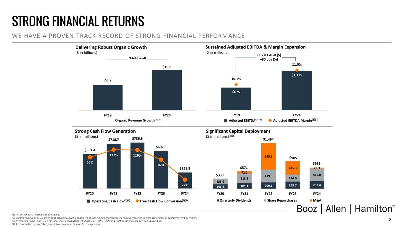 7 Broad Customer Base(1) BROAD CUSTOMER BASE WE SERVE A BROAD CUSTOMER BASE THAT SPANS ACROSS THE U.S. GOVERN MENT AND COMMERCIAL MARKETS + U.S. Intelligence Agencies: National Security Agency, National Geospatial-Intelligence Agency, National Reconnaissance Office + Military Intelligence Agencies: Defense Intelligence Agency, Service Intelligence Centers, Intelligence Surveillance Reconnaissance Units INTELLIGENCE, 17% + Aerospace: Air Force, Space Force, NASA + Army + Joint Combatant Commands + Navy/Marine Corps DEFENSE, 47% CIVIL, 36% (2) + Homeland Security + Health & Human Services + Justice + Treasury + Veterans Affairs (1) All percentages of revenue are approximate; exact percentages of revenue are reported in our Form 10-K for the fiscal year ended March 31, 2024. (2) Includes Global Commercial revenue, which was 2 percent of total revenue in fiscal year 2024. Given its small relative size, Global Commercial revenue will be reported with Civil.