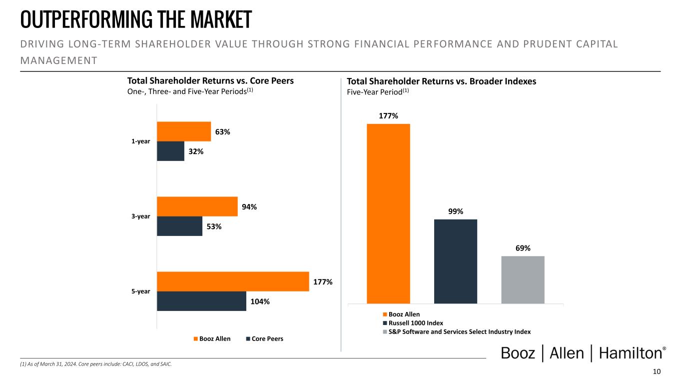 9 CAPITAL DEPLOYMENT: FY24 IN REVIEW OUR DEPLOYMENT PRIORITIES FOLLOW A DISCIPLINED, OPPORTUNISTIC AP PROACH THAT MAXIMIZES NEAR- AND LONG- TERM SHAREHOLDER VALUE We remain committed to a balanced capital allocation strategy to maximize long-term shareholder value In FY24, we deployed ~$692M through a mix of quarterly dividends, strategic investments, and share repurchases (1) As measured over a five-year period. Quarterly Dividends Sustained strong annual dividend growth since 2013 • ~$253M in quarterly dividends • 11th consecutive fiscal year increasing our quarterly dividend • ~42% historical dividend payout ratio(1) Capital Expenditures • Focused investments in IP/IC to help deliver differentiated mission solutions • Ongoing investments that support the shifting needs of the business, including modernizing secured facilities and supporting our hybrid work model Driving growth through strategic investments in our infrastructure Share Repurchases • ~$415M in share repurchases • Opportunistically look for periods where shares trade below market value; balance with other capital needs Opportunistic share buybacks, based on changing economic conditions and market performance Strategic Transactions Strategic investments to fuel growth • ~$23M in strategic investments in leading-edge technical solutions, like Albedo and Second Front Systems, to accelerate mission delivery