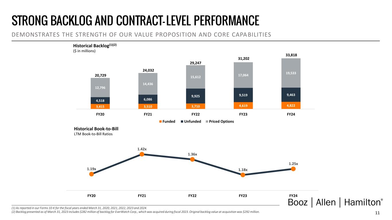 10 177% 99% 69% Category 1Booz Allen Russell 1000 Index S&P Software and Services Select Industry Index 104% 53% 32% 177% 94% 63% 5-year 3-year 1-year Booz Allen Core Peers OUTPERFORMING THE MARKET DRIVING LONG-TERM SHAREHOLDER VALUE THROUGH STRONG FINANCIAL PERFORMANCE AND PRUDENT CAPITAL MANAGEMENT Total Shareholder Returns vs. Core Peers One-, Three- and Five-Year Periods(1) Total Shareholder Returns vs. Broader Indexes Five-Year Period(1) (1) As of March 31, 2024. Core peers include: CACI, LDOS, and SAIC.