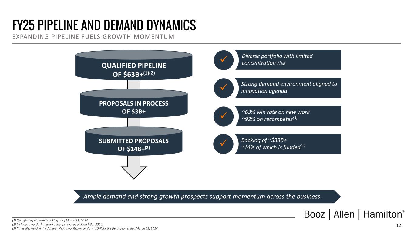 11 STRONG BACKLOG AND CONTRACT- LEVEL PERFORMANCE DEMONSTRATES THE STRENGTH OF OUR VALUE PROPOSITION AND CORE CAPA BILITIES Historical Backlog(1)(2) ($ in millions) (1) As reported in our Forms 10-K for the fiscal years ended March 31, 2020, 2021, 2022, 2023 and 2024. (2) Backlog presented as of March 31, 2023 includes $282 million of backlog for EverWatch Corp., which was acquired during fiscal 2023. Original backlog value at acquisition was $292 million. Historical Book-to-Bill LTM Book-to-Bill Ratios 3,415 3,510 3,710 4,619 4,822 4,518 6,086 9,925 9,519 9,463 12,796 14,436 15,612 17,064 19,533 FY20 FY21 FY22 FY23 FY24 Funded Unfunded Priced Options 20,729 24,032 29,247 31,202 33,818 1.19x 1.42x 1.36x 1.18x 1.25x FY20 FY21 FY22 FY23 FY24