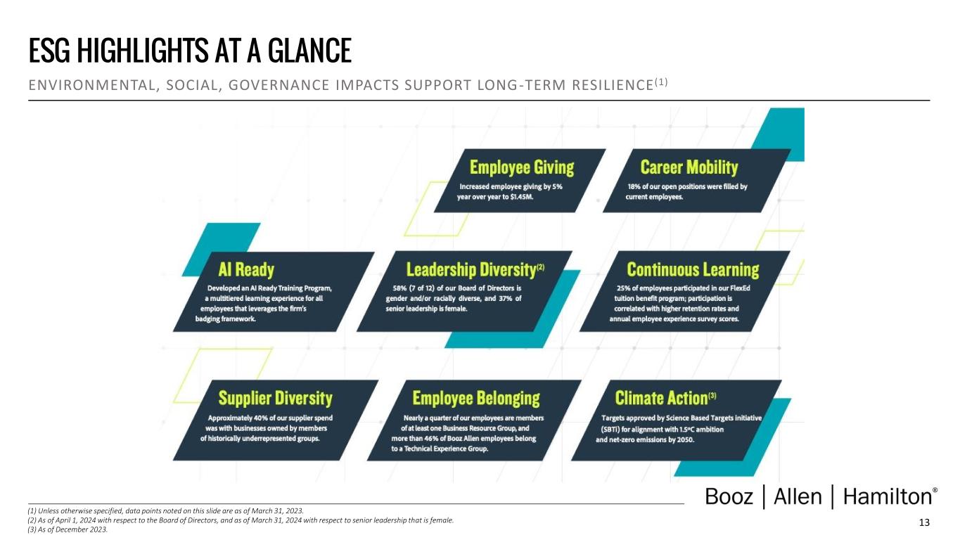 12 FY25 PIPELINE AND DEMAND DYNAMICS EXPANDING PIPELINE FUELS GROWTH MOMENTUM (1) Qualified pipeline and backlog as of March 31, 2024. (2) Includes awards that were under protest as of March 31, 2024. (3) Rates disclosed in the Company’s Annual Report on Form 10-K for the fiscal year ended March 31, 2024. Consideration Conversion Diverse portfolio with limited concentration risk✓ Strong demand environment aligned to innovation agenda✓ ~63% win rate on new work ~92% on recompetes(3)✓ Backlog of ~$33B+ ~14% of which is funded(1)✓ Ample demand and strong growth prospects support momentum across the business. QUALIFIED PIPELINE OF $63B+(1)(2) PROPOSALS IN PROCESS OF $3B+ SUBMITTED PROPOSALS OF $14B+(2)