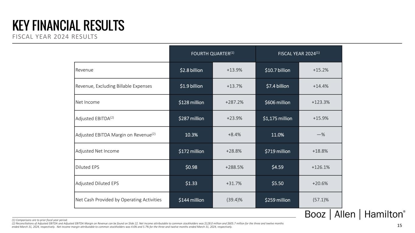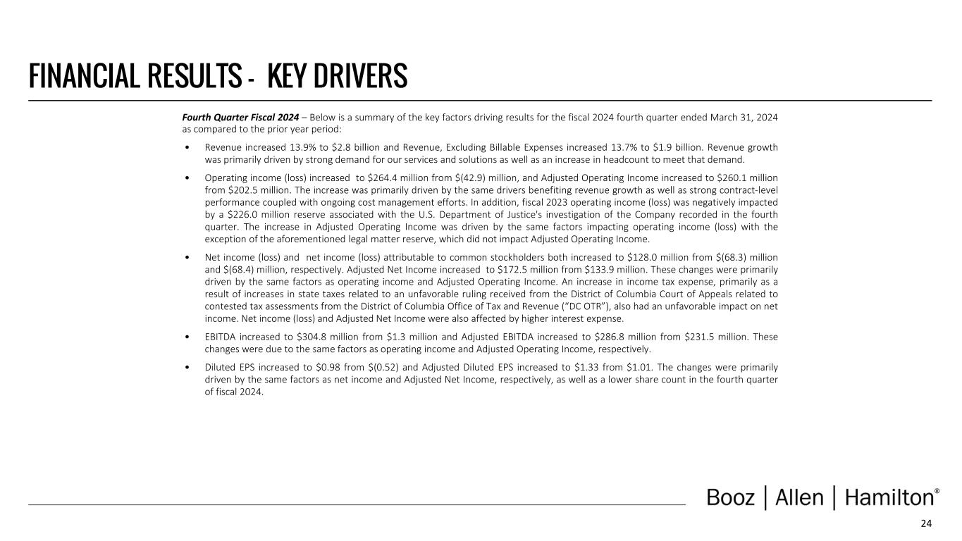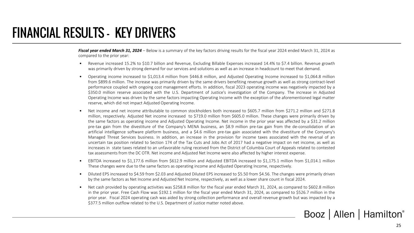 24 FINANCIAL RESULTS – KEY DRIVERS Fourth Quarter Fiscal 2024 – Below is a summary of the key factors driving results for the fiscal 2024 fourth quarter ended March 31, 2024 as compared to the prior year period: • Revenue increased 13.9% to $2.8 billion and Revenue, Excluding Billable Expenses increased 13.7% to $1.9 billion. Revenue growth was primarily driven by strong demand for our services and solutions as well as an increase in headcount to meet that demand. • Operating income (loss) increased to $264.4 million from $(42.9) million, and Adjusted Operating Income increased to $260.1 million from $202.5 million. The increase was primarily driven by the same drivers benefiting revenue growth as well as strong contract-level performance coupled with ongoing cost management efforts. In addition, fiscal 2023 operating income (loss) was negatively impacted by a $226.0 million reserve associated with the U.S. Department of Justice's investigation of the Company recorded in the fourth quarter. The increase in Adjusted Operating Income was driven by the same factors impacting operating income (loss) with the exception of the aforementioned legal matter reserve, which did not impact Adjusted Operating Income. • Net income (loss) and net income (loss) attributable to common stockholders both increased to $128.0 million from $(68.3) million and $(68.4) million, respectively. Adjusted Net Income increased to $172.5 million from $133.9 million. These changes were primarily driven by the same factors as operating income and Adjusted Operating Income. An increase in income tax expense, primarily as a result of increases in state taxes related to an unfavorable ruling received from the District of Columbia Court of Appeals related to contested tax assessments from the District of Columbia Office of Tax and Revenue (“DC OTR”), also had an unfavorable impact on net income. Net income (loss) and Adjusted Net Income were also affected by higher interest expense. • EBITDA increased to $304.8 million from $1.3 million and Adjusted EBITDA increased to $286.8 million from $231.5 million. These changes were due to the same factors as operating income and Adjusted Operating Income, respectively. • Diluted EPS increased to $0.98 from $(0.52) and Adjusted Diluted EPS increased to $1.33 from $1.01. The changes were primarily driven by the same factors as net income and Adjusted Net Income, respectively, as well as a lower share count in the fourth quarter of fiscal 2024.