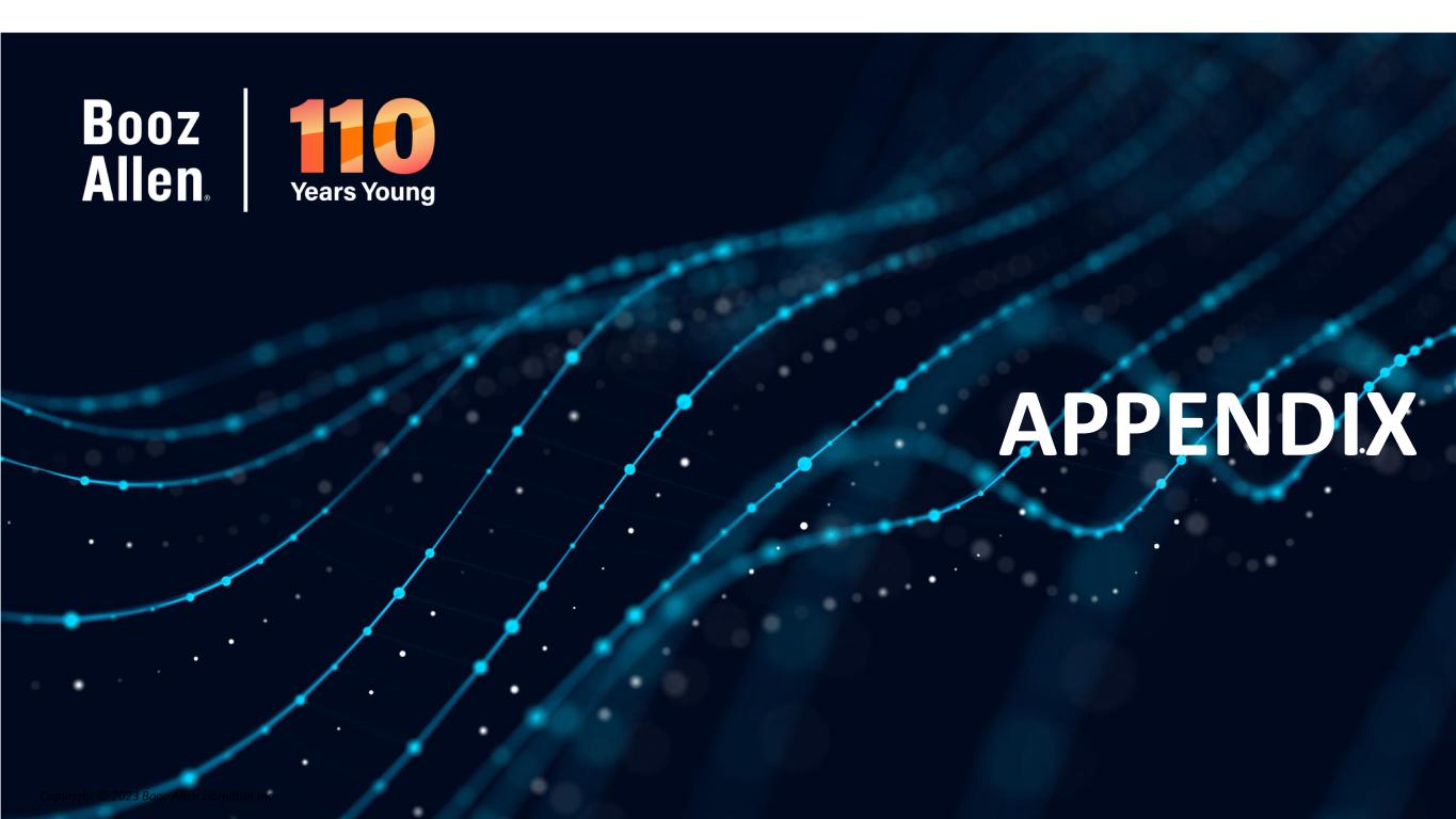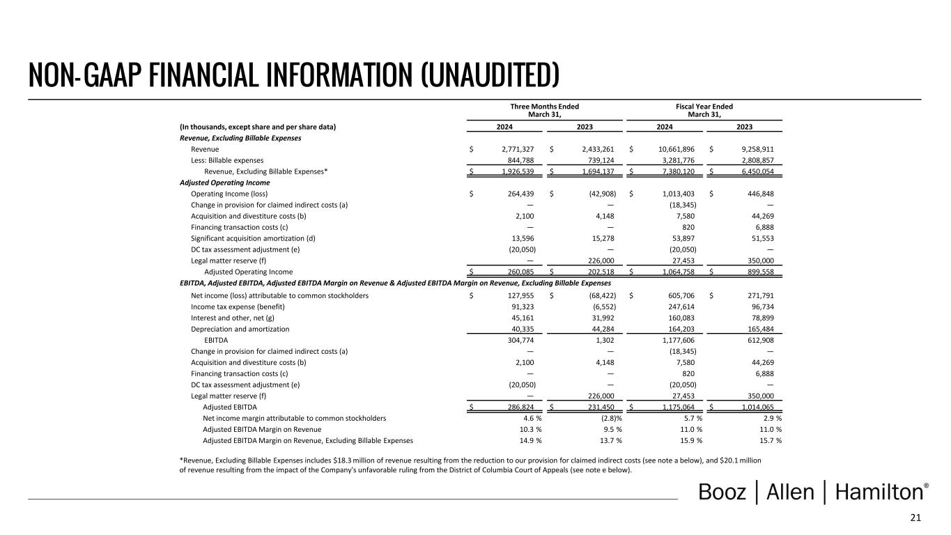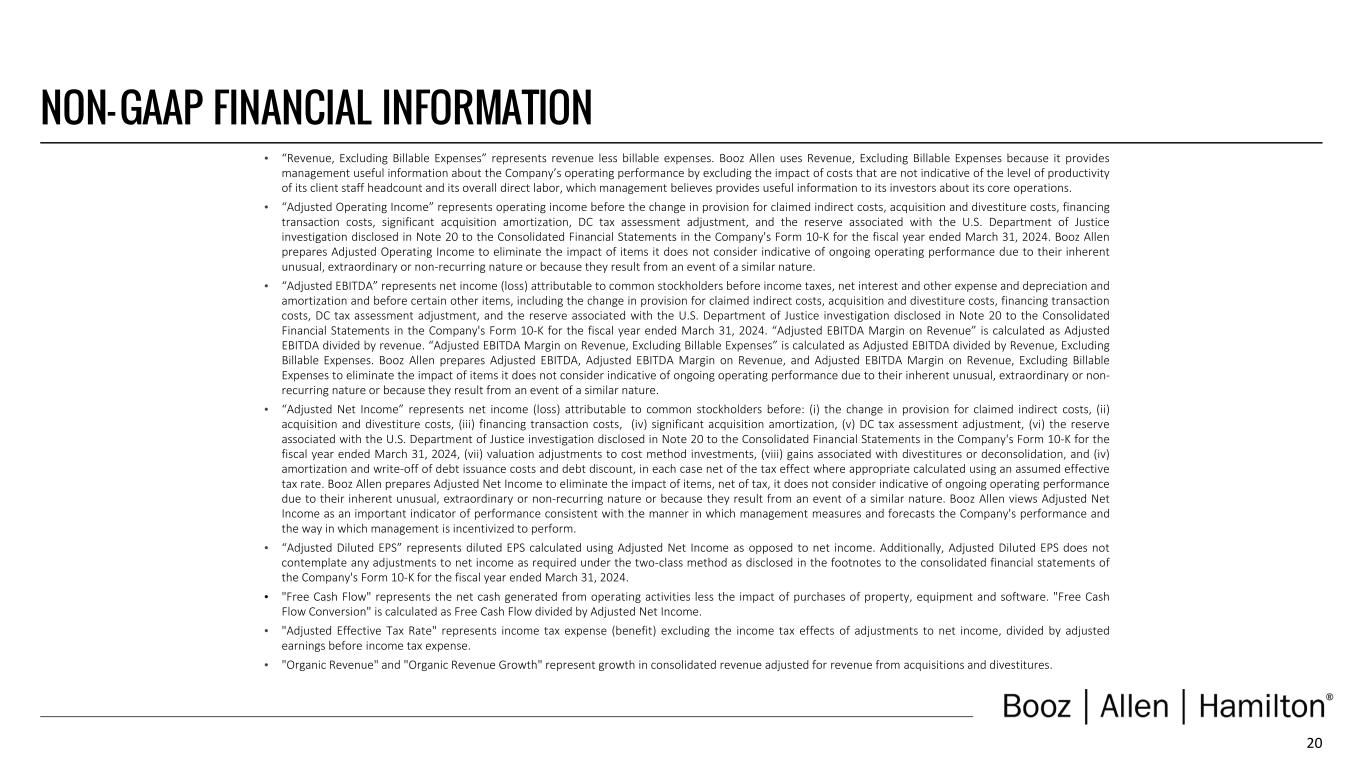 20 NON- GAAP FINANCIAL INFORMATION • “Revenue, Excluding Billable Expenses” represents revenue less billable expenses. Booz Allen uses Revenue, Excluding Billable Expenses because it provides management useful information about the Company’s operating performance by excluding the impact of costs that are not indicative of the level of productivity of its client staff headcount and its overall direct labor, which management believes provides useful information to its investors about its core operations. • “Adjusted Operating Income” represents operating income before the change in provision for claimed indirect costs, acquisition and divestiture costs, financing transaction costs, significant acquisition amortization, DC tax assessment adjustment, and the reserve associated with the U.S. Department of Justice investigation disclosed in Note 20 to the Consolidated Financial Statements in the Company's Form 10-K for the fiscal year ended March 31, 2024. Booz Allen prepares Adjusted Operating Income to eliminate the impact of items it does not consider indicative of ongoing operating performance due to their inherent unusual, extraordinary or non-recurring nature or because they result from an event of a similar nature. • “Adjusted EBITDA” represents net income (loss) attributable to common stockholders before income taxes, net interest and other expense and depreciation and amortization and before certain other items, including the change in provision for claimed indirect costs, acquisition and divestiture costs, financing transaction costs, DC tax assessment adjustment, and the reserve associated with the U.S. Department of Justice investigation disclosed in Note 20 to the Consolidated Financial Statements in the Company's Form 10-K for the fiscal year ended March 31, 2024. “Adjusted EBITDA Margin on Revenue” is calculated as Adjusted EBITDA divided by revenue. “Adjusted EBITDA Margin on Revenue, Excluding Billable Expenses” is calculated as Adjusted EBITDA divided by Revenue, Excluding Billable Expenses. Booz Allen prepares Adjusted EBITDA, Adjusted EBITDA Margin on Revenue, and Adjusted EBITDA Margin on Revenue, Excluding Billable Expenses to eliminate the impact of items it does not consider indicative of ongoing operating performance due to their inherent unusual, extraordinary or non- recurring nature or because they result from an event of a similar nature. • “Adjusted Net Income” represents net income (loss) attributable to common stockholders before: (i) the change in provision for claimed indirect costs, (ii) acquisition and divestiture costs, (iii) financing transaction costs, (iv) significant acquisition amortization, (v) DC tax assessment adjustment, (vi) the reserve associated with the U.S. Department of Justice investigation disclosed in Note 20 to the Consolidated Financial Statements in the Company's Form 10-K for the fiscal year ended March 31, 2024, (vii) valuation adjustments to cost method investments, (viii) gains associated with divestitures or deconsolidation, and (iv) amortization and write-off of debt issuance costs and debt discount, in each case net of the tax effect where appropriate calculated using an assumed effective tax rate. Booz Allen prepares Adjusted Net Income to eliminate the impact of items, net of tax, it does not consider indicative of ongoing operating performance due to their inherent unusual, extraordinary or non-recurring nature or because they result from an event of a similar nature. Booz Allen views Adjusted Net Income as an important indicator of performance consistent with the manner in which management measures and forecasts the Company's performance and the way in which management is incentivized to perform. • “Adjusted Diluted EPS” represents diluted EPS calculated using Adjusted Net Income as opposed to net income. Additionally, Adjusted Diluted EPS does not contemplate any adjustments to net income as required under the two-class method as disclosed in the footnotes to the consolidated financial statements of the Company's Form 10-K for the fiscal year ended March 31, 2024. • "Free Cash Flow" represents the net cash generated from operating activities less the impact of purchases of property, equipment and software. "Free Cash Flow Conversion" is calculated as Free Cash Flow divided by Adjusted Net Income. • "Adjusted Effective Tax Rate" represents income tax expense (benefit) excluding the income tax effects of adjustments to net income, divided by adjusted earnings before income tax expense. • "Organic Revenue" and "Organic Revenue Growth" represent growth in consolidated revenue adjusted for revenue from acquisitions and divestitures.