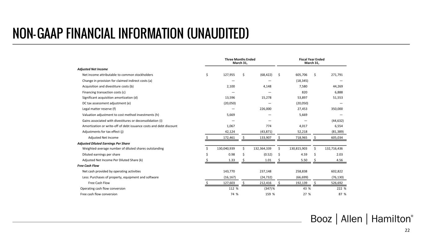 21 Three Months Ended March 31, Fiscal Year Ended March 31, (In thousands, except share and per share data) 2024 2023 2024 2023 Revenue, Excluding Billable Expenses Revenue $ 2,771,327 $ 2,433,261 $ 10,661,896 $ 9,258,911 Less: Billable expenses 844,788 739,124 3,281,776 2,808,857 Revenue, Excluding Billable Expenses* $ 1,926,539 $ 1,694,137 $ 7,380,120 $ 6,450,054 Adjusted Operating Income Operating Income (loss) $ 264,439 $ (42,908) $ 1,013,403 $ 446,848 Change in provision for claimed indirect costs (a) — — (18,345) — Acquisition and divestiture costs (b) 2,100 4,148 7,580 44,269 Financing transaction costs (c) — — 820 6,888 Significant acquisition amortization (d) 13,596 15,278 53,897 51,553 DC tax assessment adjustment (e) (20,050) — (20,050) — Legal matter reserve (f) — 226,000 27,453 350,000 Adjusted Operating Income $ 260,085 $ 202,518 $ 1,064,758 $ 899,558 EBITDA, Adjusted EBITDA, Adjusted EBITDA Margin on Revenue & Adjusted EBITDA Margin on Revenue, Excluding Billable Expenses Net income (loss) attributable to common stockholders $ 127,955 $ (68,422) $ 605,706 $ 271,791 Income tax expense (benefit) 91,323 (6,552) 247,614 96,734 Interest and other, net (g) 45,161 31,992 160,083 78,899 Depreciation and amortization 40,335 44,284 164,203 165,484 EBITDA 304,774 1,302 1,177,606 612,908 Change in provision for claimed indirect costs (a) — — (18,345) — Acquisition and divestiture costs (b) 2,100 4,148 7,580 44,269 Financing transaction costs (c) — — 820 6,888 DC tax assessment adjustment (e) (20,050) — (20,050) — Legal matter reserve (f) — 226,000 27,453 350,000 Adjusted EBITDA $ 286,824 $ 231,450 $ 1,175,064 $ 1,014,065 Net income margin attributable to common stockholders 4.6 % (2.8) % 5.7 % 2.9 % Adjusted EBITDA Margin on Revenue 10.3 % 9.5 % 11.0 % 11.0 % Adjusted EBITDA Margin on Revenue, Excluding Billable Expenses 14.9 % 13.7 % 15.9 % 15.7 % *Revenue, Excluding Billable Expenses includes $18.3 million of revenue resulting from the reduction to our provision for claimed indirect costs (see note a below), and $20.1 million of revenue resulting from the impact of the Company's unfavorable ruling from the District of Columbia Court of Appeals (see note e below). NON- GAAP FINANCIAL INFORMATION (UNAUDITED)