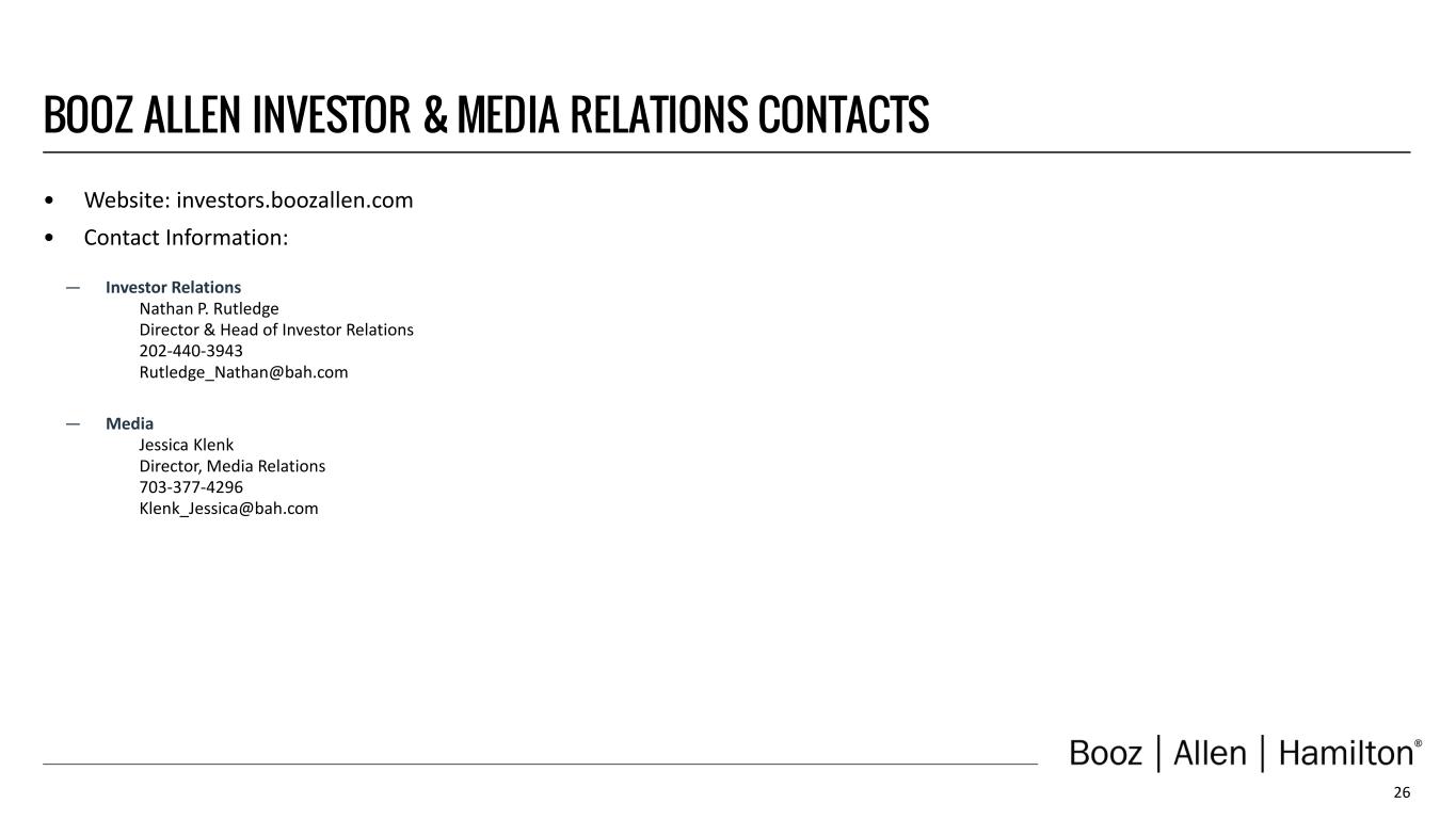 26 • Website: investors.boozallen.com • Contact Information: ― Investor Relations Nathan P. Rutledge Director & Head of Investor Relations 202-440-3943 Rutledge_Nathan@bah.com ― Media Jessica Klenk Director, Media Relations 703-377-4296 Klenk_Jessica@bah.com BOOZ ALLEN INVESTOR & MEDIA RELATIONS CONTACTS