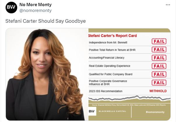 | 4. | Mr. Bennett said that Blackwells has a “history of running misguided, unsuccessful efforts.” Blackwells has created tens of billions of dollars in value for fellow shareholders in its public campaigns, while Mr. Bennett has turned every REIT he has ever gotten his fingers on into illiquid, mismanaged and debt-ridden disasters. |