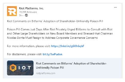 Riot cautions Riot shareholders, Bitfarms shareholders and others considering trading in Riot securities or Bitfarms securities that the proposal Riot has made for a business combination transaction with Bitfarms is non-binding, does not constitute and should not be construed as an offer or intention to make an offer directly to Bitfarms shareholders, and there can be no assurance that any definitive offer will be made by Riot, that Bitfarms will accept any offer made by Riot, that any agreement will be entered into by Riot and Bitfarms or that the proposal or any other transaction will be approved or consummated. Riot does not undertake any obligation to provide any updates with respect to the proposed transaction, except as required by applicable law.