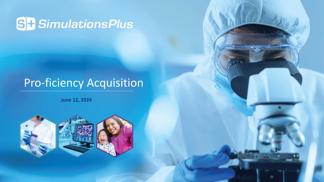LANCASTER, CA, JUNE 12, 2024 – Simulations Plus, Inc. (Nasdaq: SLP) (“Simulations Plus”), a leading provider of modeling and simulation software and services for pharmaceutical safety and efficacy, today announced the acquisition of Pro-ficiency Holdings, Inc. and its subsidiaries (“Pro-ficiency”), a leader in providing simulation-enabled performance and intelligence solutions for clinical and commercial drug development. Simulations Plus acquired Pro-ficiency from QHP Capital, L.P. (management company for NovaQuest Private Equity) (“QHP Capital”) and Pro-ficiency’s minority shareholders for approximately $100 million in cash.