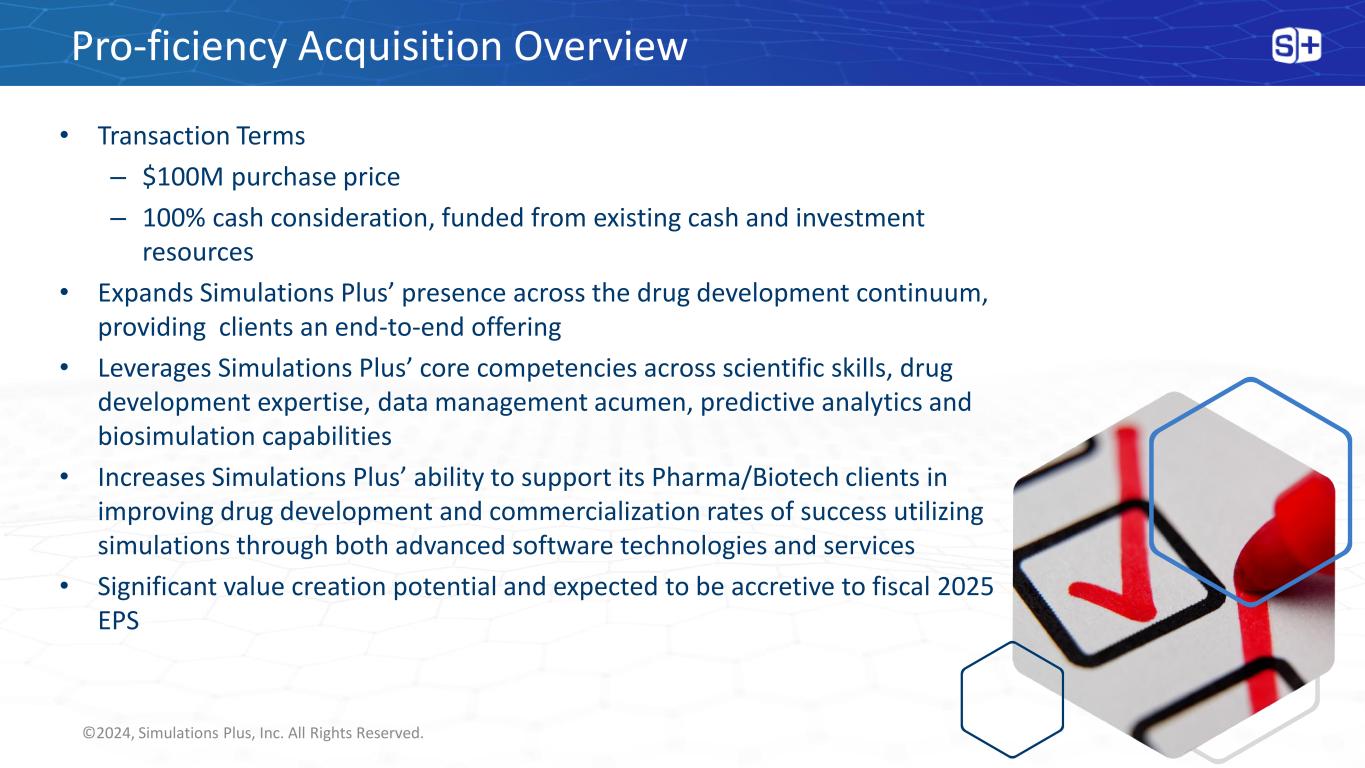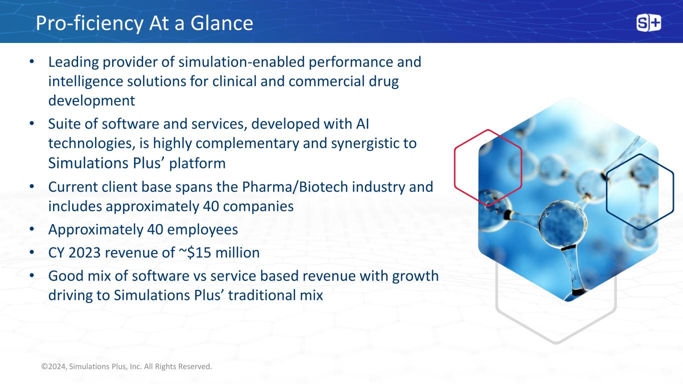 ©2024, Simulations Plus, Inc. All Rights Reserved. Pro-ficiency Acquisition Overview • Transaction Terms – $100M purchase price – 100% cash consideration, funded from existing cash and investment resources • Expands Simulations Plus’ presence across the drug development continuum, providing clients an end-to-end offering • Leverages Simulations Plus’ core competencies across scientific skills, drug development expertise, data management acumen, predictive analytics and biosimulation capabilities • Increases Simulations Plus’ ability to support its Pharma/Biotech clients in improving drug development and commercialization rates of success utilizing simulations through both advanced software technologies and services • Significant value creation potential and expected to be accretive to fiscal 2025 EPS