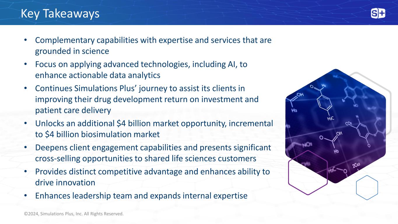 ©2024, Simulations Plus, Inc. All Rights Reserved. Key Takeaways • Complementary capabilities with expertise and services that are grounded in science • Focus on applying advanced technologies, including AI, to enhance actionable data analytics • Continues Simulations Plus’ journey to assist its clients in improving their drug development return on investment and patient care delivery • Unlocks an additional $4 billion market opportunity, incremental to $4 billion biosimulation market • Deepens client engagement capabilities and presents significant cross-selling opportunities to shared life sciences customers • Provides distinct competitive advantage and enhances ability to drive innovation • Enhances leadership team and expands internal expertise