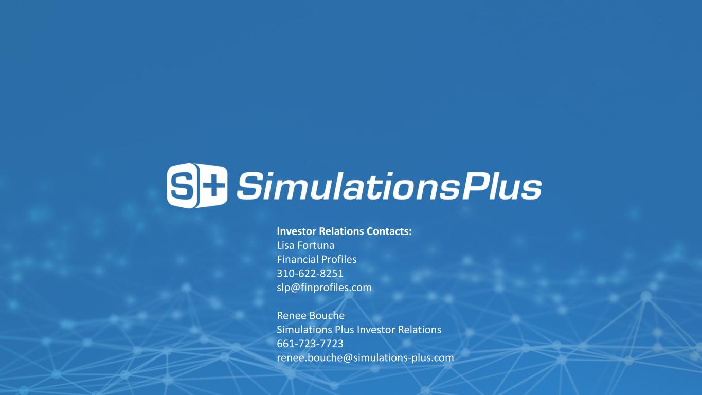 Investor Relations Contacts: Lisa Fortuna Financial Profiles 310-622-8251 slp@finprofiles.com Renee Bouche Simulations Plus Investor Relations 661-723-7723 renee.bouche@simulations-plus.com