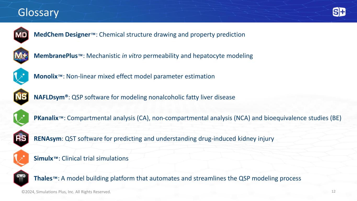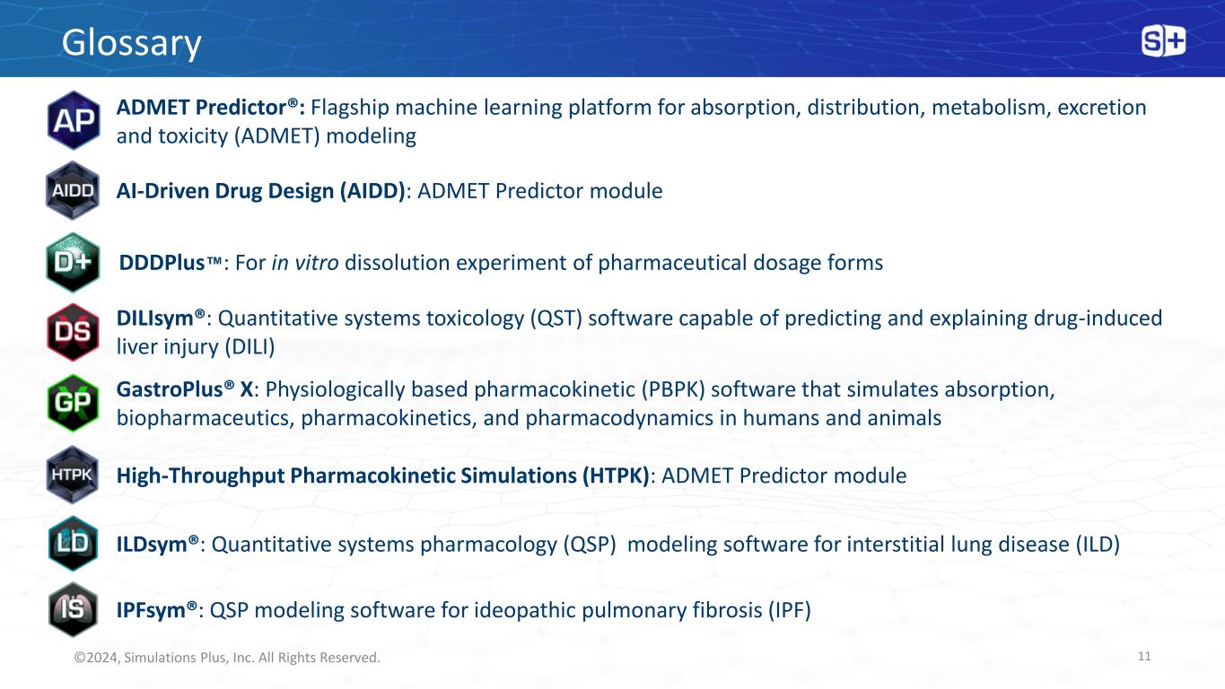 ©2024, Simulations Plus, Inc. All Rights Reserved. Glossary 11 ADMET Predictor®: Flagship machine learning platform for absorption, distribution, metabolism, excretion and toxicity (ADMET) modeling AI-Driven Drug Design (AIDD): ADMET Predictor module DILIsym®: Quantitative systems toxicology (QST) software capable of predicting and explaining drug-induced liver injury (DILI) GastroPlus® X: Physiologically based pharmacokinetic (PBPK) software that simulates absorption, biopharmaceutics, pharmacokinetics, and pharmacodynamics in humans and animals High-Throughput Pharmacokinetic Simulations (HTPK): ADMET Predictor module ILDsym®: Quantitative systems pharmacology (QSP) modeling software for interstitial lung disease (ILD) IPFsym®: QSP modeling software for ideopathic pulmonary fibrosis (IPF) DDDPlus : For in vitro dissolution experiment of pharmaceutical dosage forms