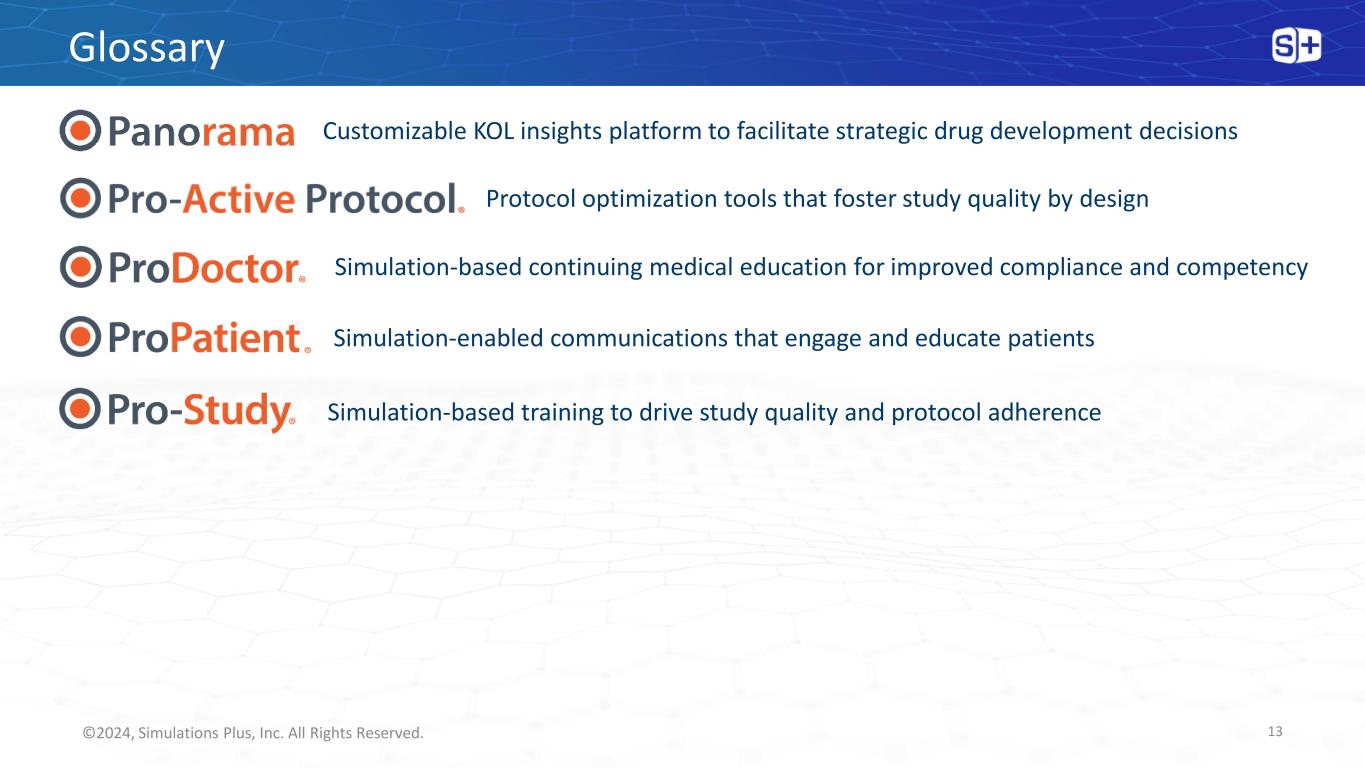 ©2024, Simulations Plus, Inc. All Rights Reserved. Simulation-based training to drive study quality and protocol adherence Simulation-enabled communications that engage and educate patients Glossary 13 Customizable KOL insights platform to facilitate strategic drug development decisions Protocol optimization tools that foster study quality by design Simulation-based continuing medical education for improved compliance and competency