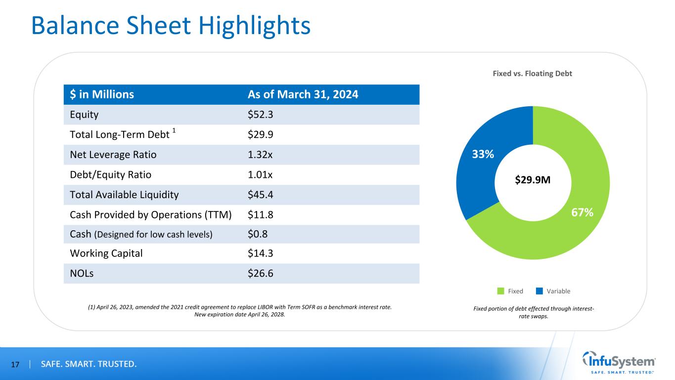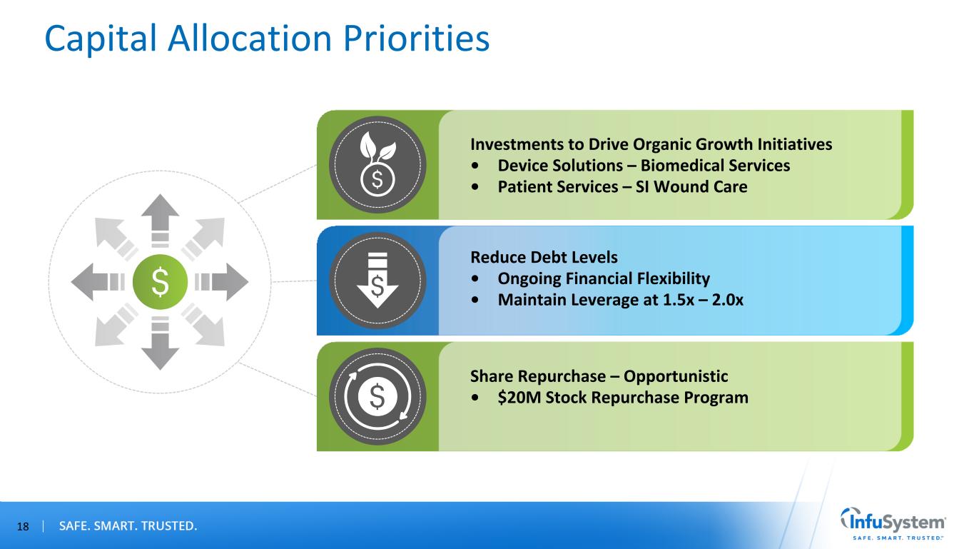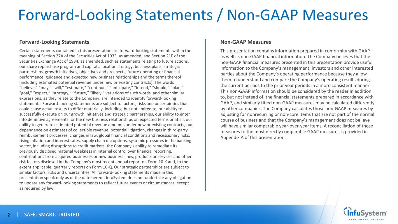 Forward-Looking Statements / Non-GAAP Measures Forward-Looking Statements Certain statements contained in this presentation are forward-looking statements within the meaning of Section 27A of the Securities Act of 1933, as amended, and Section 21E of the Securities Exchange Act of 1934, as amended, such as statements relating to future actions, our share repurchase program and capital allocation strategy, business plans, strategic partnerships, growth initiatives, objectives and prospects, future operating or financial performance, guidance and expected new business relationships and the terms thereof (including estimated potential revenue under new or existing contracts). The words “believe,” “may,” “will,” “estimate,” “continue,” “anticipate,” “intend,” “should,” “plan,” "goal," “expect,” “strategy,” “future,” “likely,” variations of such words, and other similar expressions, as they relate to the Company, are intended to identify forward-looking statements. Forward-looking statements are subject to factors, risks and uncertainties that could cause actual results to differ materially, including, but not limited to, our ability to successfully execute on our growth initiatives and strategic partnerships, our ability to enter into definitive agreements for the new business relationships on expected terms or at all, our ability to generate estimated potential revenue amounts under new or existing contracts, our dependence on estimates of collectible revenue, potential litigation, changes in third-party reimbursement processes, changes in law, global financial conditions and recessionary risks, rising inflation and interest rates, supply chain disruptions, systemic pressures in the banking sector, including disruptions to credit markets, the Company's ability to remediate its previously disclosed material weakness in internal control over financial reporting, contributions from acquired businesses or new business lines, products or services and other risk factors disclosed in the Company’s most recent annual report on Form 10-K and, to the extent applicable, quarterly reports on Form 10-Q. Our strategic partnerships are subject to similar factors, risks and uncertainties. All forward-looking statements made in this presentation speak only as of the date hereof. InfuSystem does not undertake any obligation to update any forward-looking statements to reflect future events or circumstances, except as required by law. Non-GAAP Measures This presentation contains information prepared in conformity with GAAP as well as non-GAAP financial information. The Company believes that the non-GAAP financial measures presented in this presentation provide useful information to the Company’s management, investors and other interested parties about the Company’s operating performance because they allow them to understand and compare the Company’s operating results during the current periods to the prior year periods in a more consistent manner. This non-GAAP information should be considered by the reader in addition to, but not instead of, the financial statements prepared in accordance with GAAP, and similarly titled non-GAAP measures may be calculated differently by other companies. The Company calculates those non-GAAP measures by adjusting for nonrecurring or non-core items that are not part of the normal course of business and that the Company’s management does not believe will have similar comparable year-over-year items. A reconciliation of those measures to the most directly comparable GAAP measures is provided in Appendix A of this presentation. 2
