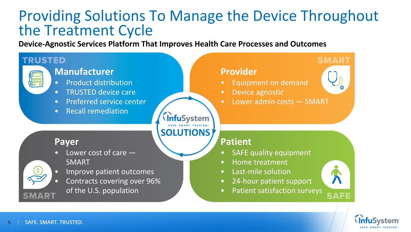 *Source: Newsweek, World's Best Hospitals 2024 4 Business Highlights A leading provider of medical equipment and patient services powered by a 100K+ device fleet in the U.S. and Canada Nearly four decades of experience, built on existing Oncology therapy model and now rapidly expanding into multiple therapies National scale, serving 18 out of 20 top-ranked hospital systems nationwide* Participating in-network provider in more than 800 health insurance networks covering over 96% of the U.S. population, serving over 2,450 sites of care Serving nearly 5,000 customer locations Seven major service areas in the U.S. and Canada with more than 500 employees
