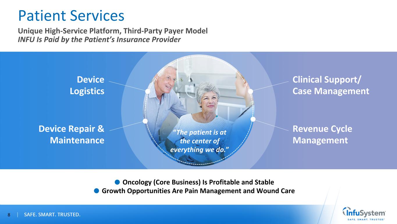 Patient Services • 800+ national payer contracts covering over 96% of U.S. population • Focused and scalable revenue cycle management team • 24/7 clinical hotline • Device agnostic Device Solutions • White Glove Concierge approach • 7 facilities serving U.S. and Canada • More than 200 biomedical technicians • Extensive repair capabilities and expertise • ISO 9001/13485 certified Competitive Advantages • Significant Barriers to Entry in Patient Services • Service-Based Competitive Advantages in Device Solutions 7