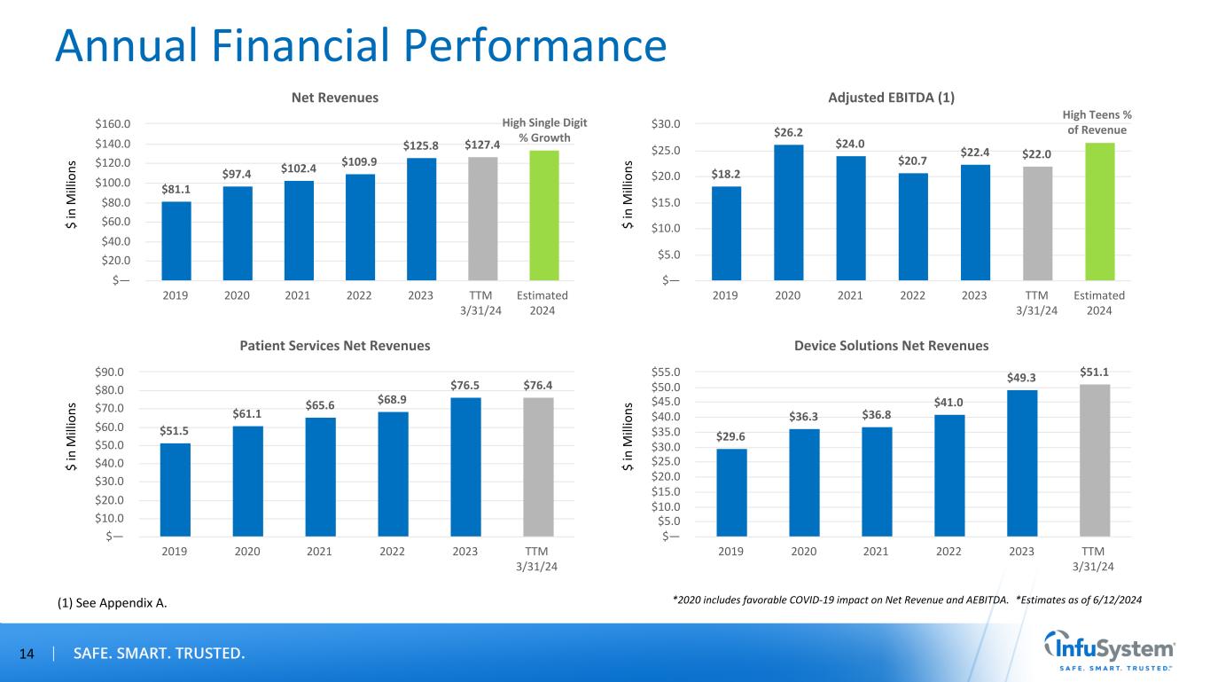 Quarterly Trends (1) See Appendix A. 13 Net Revenue Quarterly Trend $21.6 $26.0 $25.1 $24.7$24.5 $24.8 $26.6 $26.5$26.8 $27.0 $27.3 $28.8 $30.4 $31.7 $31.9 $31.8$32.0 2020 2021 2022 2023 2024 1st Quarter 2nd Quarter 3rd Quarter 4th Quarter $— $10.0 $20.0 $30.0 $40.0 Adjusted EBITDA Quarterly Trend (1) $4.0 $8.5 $7.5 $6.2$6.2 $5.9 $5.5 $6.5 $4.1 $5.5 $5.6 $5.5 $4.2 $5.8 $6.2 $6.2 $3.9 2020 2021 2022 2023 2024 1st Quarter 2nd Quarter 3rd Quarter 4th Quarter $— $1.0 $2.0 $3.0 $4.0 $5.0 $6.0 $7.0 $8.0 $9.0 $ in M ill io ns $ in M ill io ns *2020 includes favorable COVID-19 impact on Net Revenue and AEBITDA.