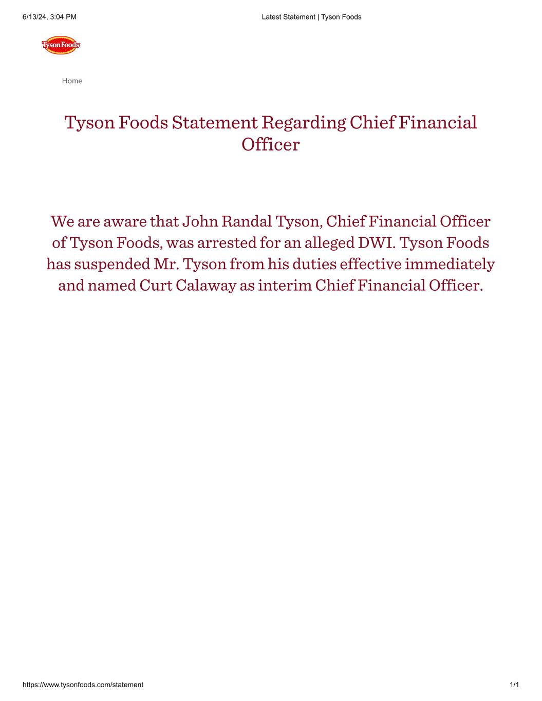 Home Tyson Foods Statement Regarding Chief Financial Officer We are aware that John Randal Tyson, Chief Financial Officer of Tyson Foods, was arrested for an alleged DWI. Tyson Foods has suspended Mr. Tyson from his duties effective immediately and named Curt Calaway as interim Chief Financial Officer. 6/13/24, 3:04 PM Latest Statement | Tyson Foods https://www.tysonfoods.com/statement 1/1