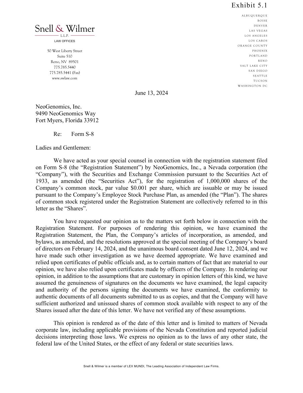 This Registration Statement on Form S-8 of NeoGenomics, Inc., a Nevada corporation (the “Company”) pertains to 1,000,000 shares of Common Stock, par value $0.001 per share (“Common Stock”), which has been authorized for issuance under the NeoGenomics, Inc. Employee Stock Purchase Plan, as amended (the “Plan”). The Plan was originally adopted in 2006 and was amended, restated, and subsequently approved on June 6, 2013 and further amended on May 25, 2017, June 1, 2018, June 2, 2022 and May 23, 2024. The Company previously registered 320,324 shares of Common Stock on a Registration Statement on Form S-8 filed with the Securities and Exchange Commission (the “SEC”) on December 19, 2006 (File No. 333-139484), 120,000 shares of Common Stock on a Registration Statement on Form S-8 filed with the SEC on April 14, 2011 (File No. 333-173494), 30,600 shares of Common Stock on a Registration Statement on Form S-8 filed with the SEC on March 14, 2012 (File No. 333-180095), 529,076 shares of Common Stock on a Registration Statement on Form S-8 filed with the SEC on June 17, 2013 (File No. 333-189391), 191,147 shares of Common Stock on a Registration Statement on Form S-8 filed with the SEC on June 2, 2021 (File No. 333-256704), and 1,000,000 shares of Common Stock on a Registration Statement on Form S-8 filed with the SEC on June 3, 2022 (File No. 333-265428) (the “Earlier Registration Statement”).