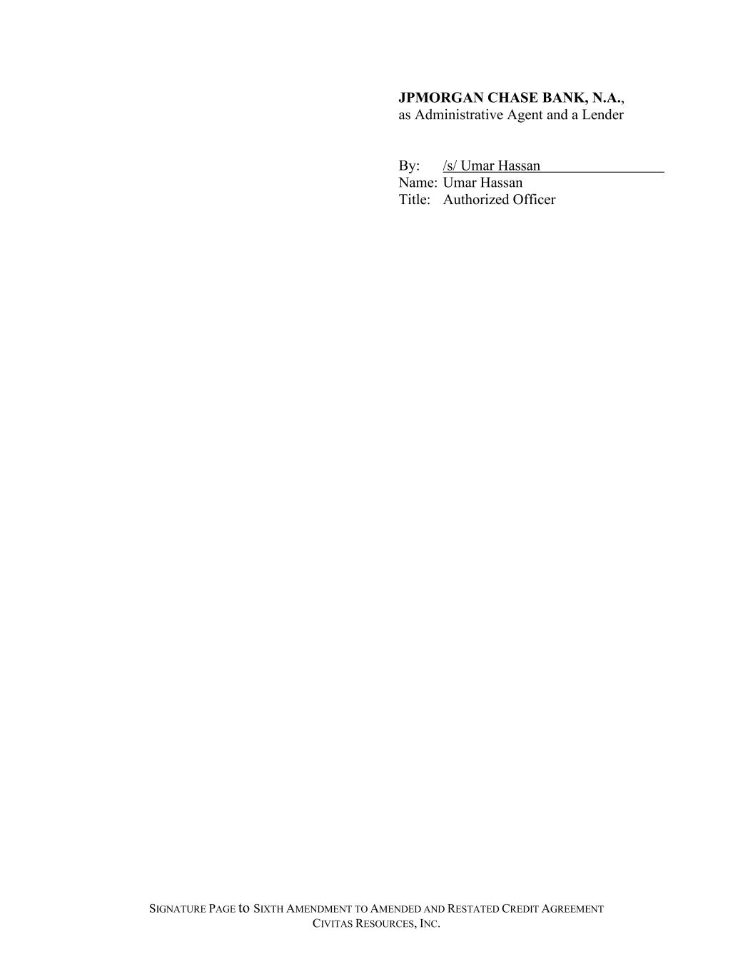 SIGNATURE PAGE to SIXTH AMENDMENT TO AMENDED AND RESTATED CREDIT AGREEMENT CIVITAS RESOURCES, INC. JPMORGAN CHASE BANK, N.A., as Administrative Agent and a Lender By: /s/ Umar Hassan Name: Umar Hassan Title: Authorized Officer