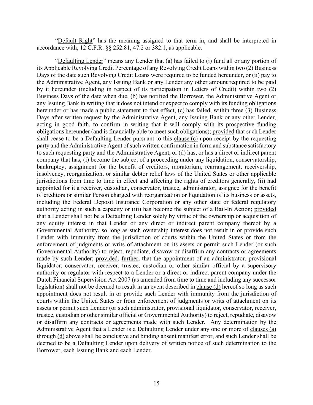 15 “Default Right” has the meaning assigned to that term in, and shall be interpreted in accordance with, 12 C.F.R. §§ 252.81, 47.2 or 382.1, as applicable. “Defaulting Lender” means any Lender that (a) has failed to (i) fund all or any portion of its Applicable Revolving Credit Percentage of any Revolving Credit Loans within two (2) Business Days of the date such Revolving Credit Loans were required to be funded hereunder, or (ii) pay to the Administrative Agent, any Issuing Bank or any Lender any other amount required to be paid by it hereunder (including in respect of its participation in Letters of Credit) within two (2) Business Days of the date when due, (b) has notified the Borrower, the Administrative Agent or any Issuing Bank in writing that it does not intend or expect to comply with its funding obligations hereunder or has made a public statement to that effect, (c) has failed, within three (3) Business Days after written request by the Administrative Agent, any Issuing Bank or any other Lender, acting in good faith, to confirm in writing that it will comply with its prospective funding obligations hereunder (and is financially able to meet such obligations); provided that such Lender shall cease to be a Defaulting Lender pursuant to this clause (c) upon receipt by the requesting party and the Administrative Agent of such written confirmation in form and substance satisfactory to such requesting party and the Administrative Agent, or (d) has, or has a direct or indirect parent company that has, (i) become the subject of a proceeding under any liquidation, conservatorship, bankruptcy, assignment for the benefit of creditors, moratorium, rearrangement, receivership, insolvency, reorganization, or similar debtor relief laws of the United States or other applicable jurisdictions from time to time in effect and affecting the rights of creditors generally, (ii) had appointed for it a receiver, custodian, conservator, trustee, administrator, assignee for the benefit of creditors or similar Person charged with reorganization or liquidation of its business or assets, including the Federal Deposit Insurance Corporation or any other state or federal regulatory authority acting in such a capacity or (iii) has become the subject of a Bail-In Action; provided that a Lender shall not be a Defaulting Lender solely by virtue of the ownership or acquisition of any equity interest in that Lender or any direct or indirect parent company thereof by a Governmental Authority, so long as such ownership interest does not result in or provide such Lender with immunity from the jurisdiction of courts within the United States or from the enforcement of judgments or writs of attachment on its assets or permit such Lender (or such Governmental Authority) to reject, repudiate, disavow or disaffirm any contracts or agreements made by such Lender; provided, further, that the appointment of an administrator, provisional liquidator, conservator, receiver, trustee, custodian or other similar official by a supervisory authority or regulator with respect to a Lender or a direct or indirect parent company under the Dutch Financial Supervision Act 2007 (as amended from time to time and including any successor legislation) shall not be deemed to result in an event described in clause (d) hereof so long as such appointment does not result in or provide such Lender with immunity from the jurisdiction of courts within the United States or from enforcement of judgments or writs of attachment on its assets or permit such Lender (or such administrator, provisional liquidator, conservator, receiver, trustee, custodian or other similar official or Governmental Authority) to reject, repudiate, disavow or disaffirm any contracts or agreements made with such Lender. Any determination by the Administrative Agent that a Lender is a Defaulting Lender under any one or more of clauses (a) through (d) above shall be conclusive and binding absent manifest error, and such Lender shall be deemed to be a Defaulting Lender upon delivery of written notice of such determination to the Borrower, each Issuing Bank and each Lender.