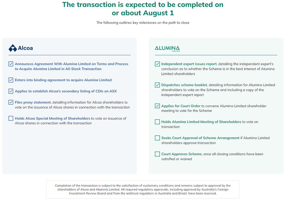 This communication does not constitute an offer to buy or sell or the solicitation of an offer to buy or sell any securities. This communication relates to the proposed transaction. On June 6, 2024, Alcoa filed with the SEC a definitive proxy statement on Schedule 14A (the “Proxy Statement”) in connection with the proposed transaction. Other documents regarding the proposed transaction may be filed with the SEC. This communication is not a substitute for the Proxy Statement or any other document that Alcoa may file with the SEC and send to its stockholders in connection with the proposed transaction. The issuance of the stock consideration in the proposed transaction will be submitted to Alcoa’s stockholders for their consideration. The Proxy Statement contains important information about Alcoa, the proposed transaction and related matters. Before making any voting decision, Alcoa’s stockholders should read all relevant documents filed or to be filed with the SEC completely and in their entirety, including the Proxy Statement, as well as any amendments or supplements to those documents, because they contain or will contain important information about Alcoa and the proposed transaction. Alcoa’s stockholders will be able to obtain a free copy of the Proxy Statement, as well as other filings containing information about Alcoa, free of charge, at the SEC’s website (www.sec.gov). Copies of the Proxy Statement and other documents filed by Alcoa with the SEC may be obtained, without charge, by contacting Alcoa through its website at https://investors.alcoa.com/.