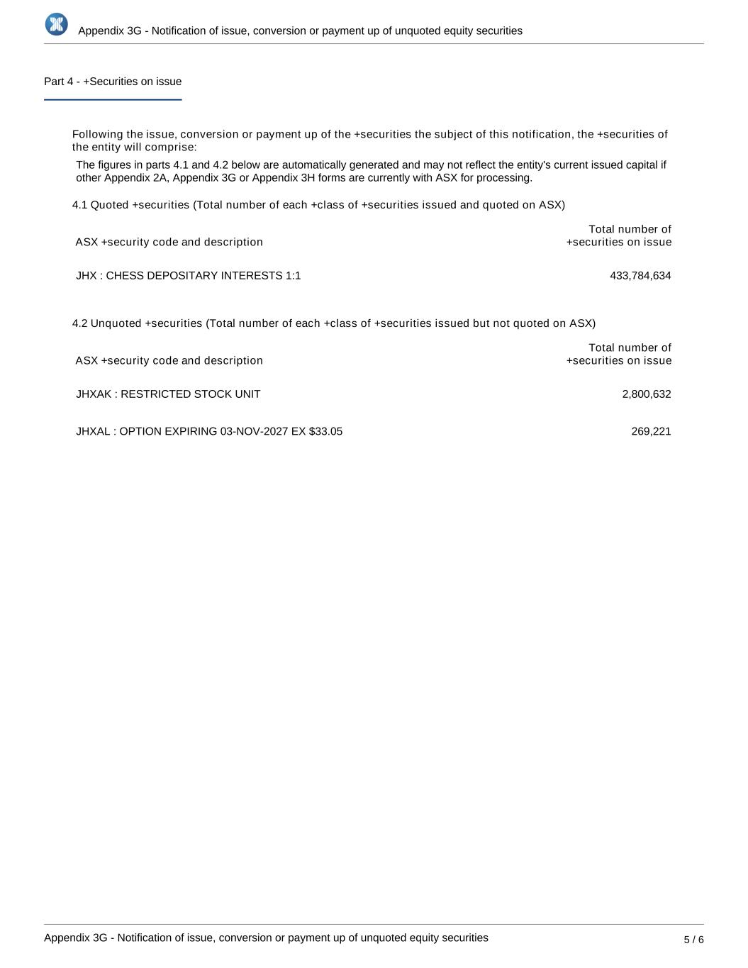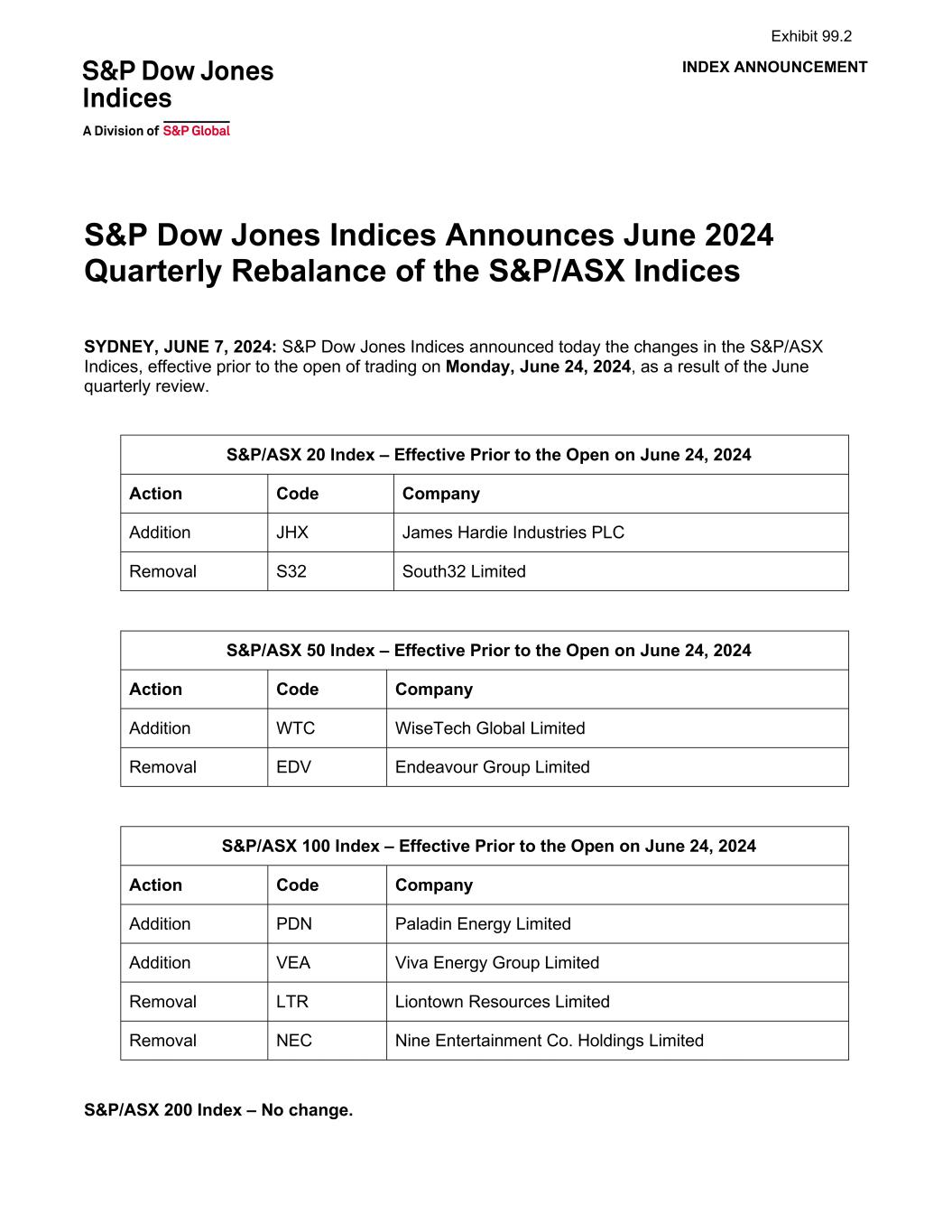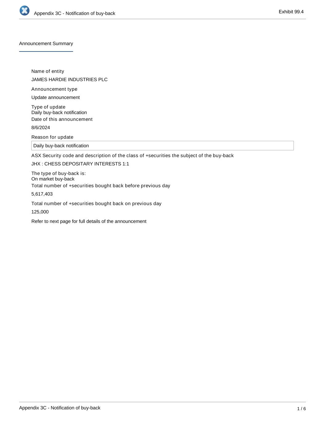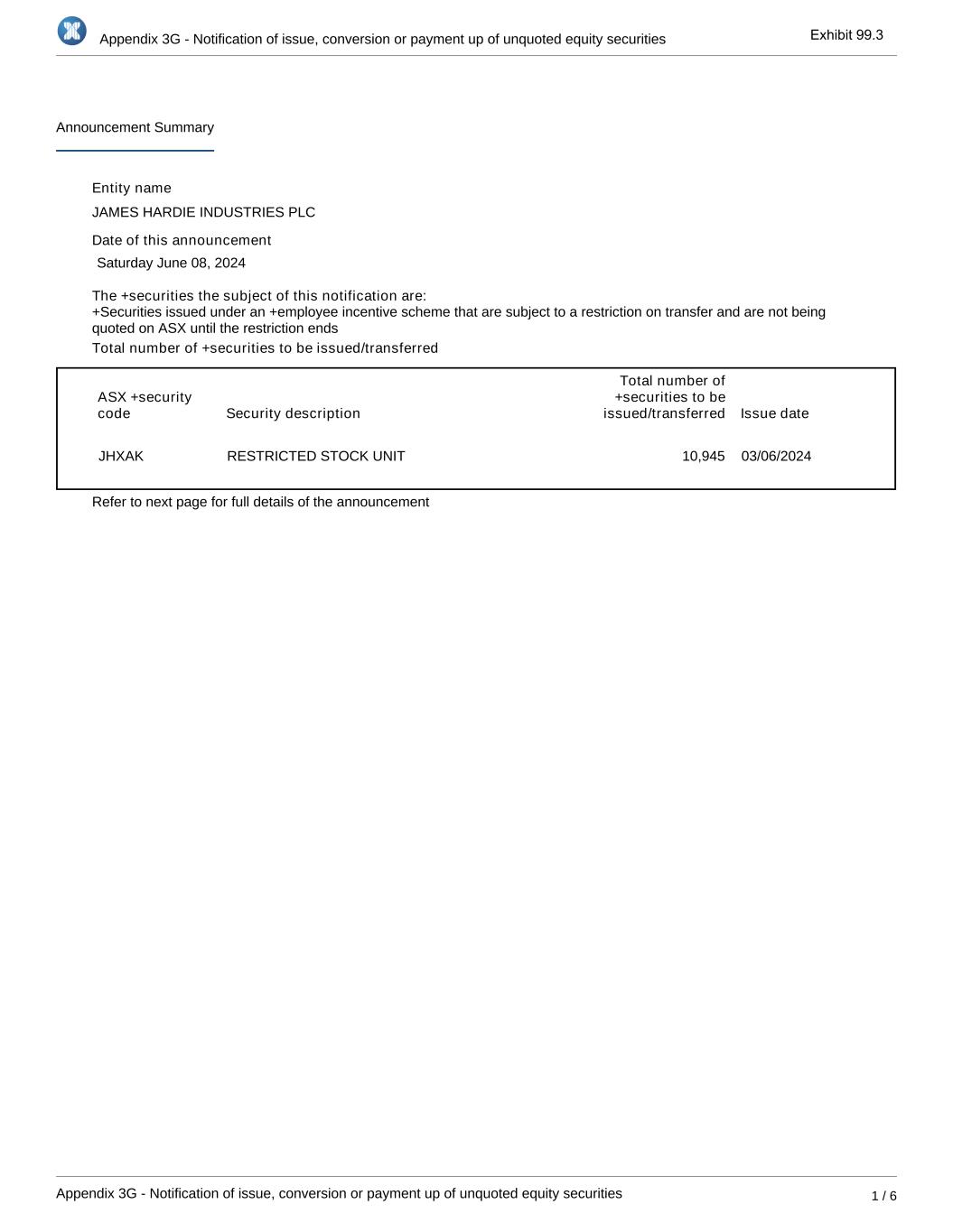 Forward-looking statements are based on the Company’s current expectations, estimates and assumptions and because forward-looking statements address future results, events and conditions, they, by their very nature, involve inherent risks and uncertainties, many of which are unforeseeable and beyond the Company’s control. Such known and unknown risks, uncertainties and other factors may cause actual results, performance or other achievements to differ materially from the anticipated results, performance or achievements expressed, projected or implied by these forward-looking statements. These factors, some of which are discussed under “Risk Factors” in Section 3 of the Form 20-F filed with the Securities and Exchange Commission on 20 May 2024, include, but are not limited to: all matters relating to or arising out of the prior manufacture of products that contained asbestos by current and former Company subsidiaries; required contributions to AICF, any shortfall in AICF funding and the effect of currency exchange rate movements on the amount recorded in the Company’s financial statements as an asbestos liability; compliance with and changes in tax laws and treatments; competition and product pricing in the markets in which the Company operates; the consequences of product failures or defects; exposure to environmental, asbestos, putative consumer class action or other legal proceedings; general economic and market conditions; the supply and cost of raw materials; possible increases in competition and the potential that competitors could copy the Company’s products; compliance with and changes in environmental and health and safety laws; risks of conducting business internationally; compliance with and changes in laws and regulations; currency exchange risks; dependence on customer preference and the concentration of the Company’s customer base; dependence on residential and commercial construction markets; the effect of adverse changes in climate or weather patterns; use of accounting estimates; and all other risks identified in the Company’s reports filed with Australian, Irish and US securities regulatory agencies and exchanges (as appropriate). The Company cautions you that the foregoing list of factors is not exhaustive and that other risks and uncertainties may cause actual results to differ materially from those referenced in the Company’s forward-looking statements. Forward-looking statements speak only as of the date they are made and are statements of the Company’s current expectations concerning future results, events and conditions. The Company assumes no obligation to update any forward-looking statements or information except as required by law.