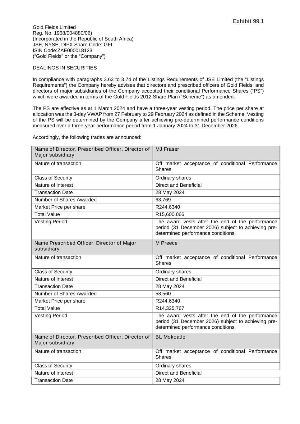 Exhibit 99.1 Gold Fields Limited Reg. No. 1968/004880/06) (Incorporated in the Republic of South Africa) JSE, NYSE, DIFX Share Code: GFI ISIN Code:ZAE000018123 (“Gold Fields” or the “Company”) DEALINGS IN SECURITIES In compliance with paragraphs 3.63 to 3.74 of the Listings Requirements of JSE Limited (the “Listings Requirements”) the Company hereby advises that directors and prescribed officers of Gold Fields, and directors of major subsidiaries of the Company accepted their conditional Performance Shares (“PS”) which were awarded in terms of the Gold Fields 2012 Share Plan (“Scheme”) as amended. The PS are effective as at 1 March 2024 and have a three-year vesting period. The price per share at allocation was the 3-day VWAP from 27 February to 29 February 2024 as defined in the Scheme. Vesting of the PS will be determined by the Company after achieving pre-determined performance conditions measured over a three-year performance period from 1 January 2024 to 31 December 2026. Accordingly, the following trades are announced: Name of Director, Prescribed Officer, Director of Major subsidiary MJ Fraser Nature of transaction Off market acceptance of conditional Performance Shares Class of Security Ordinary shares Nature of interest Direct and Beneficial Transaction Date 28 May 2024 Number of Shares Awarded 63,769 Market Price per share R244.6340 Total Value R15,600,066 Vesting Period The award vests after the end of the performance period (31 December 2026) subject to achieving pre- determined performance conditions. Name Prescribed Officer, Director of Major subsidiary M Preece Nature of transaction Off market acceptance of conditional Performance Shares Class of Security Ordinary shares Nature of interest Direct and Beneficial Transaction Date 28 May 2024 Number of Shares Awarded 58,560 Market Price per share R244.6340 Total Value R14,325,767 Vesting Period The award vests after the end of the performance period (31 December 2026) subject to achieving pre- determined performance conditions. Name of Director, Prescribed Officer, Director of Major subsidiary BL Mokoatle Nature of transaction Off market acceptance of conditional Performance Shares Class of Security Ordinary shares Nature of interest Direct and Beneficial Transaction Date 28 May 2024