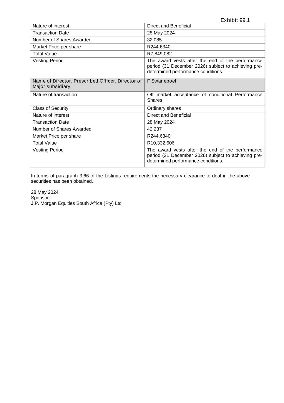 Exhibit 99.1 Nature of interest Direct and Beneficial Transaction Date 28 May 2024 Number of Shares Awarded 32,085 Market Price per share R244.6340 Total Value R7,849,082 Vesting Period The award vests after the end of the performance period (31 December 2026) subject to achieving pre- determined performance conditions. Name of Director, Prescribed Officer, Director of Major subsidiary F Swanepoel Nature of transaction Off market acceptance of conditional Performance Shares Class of Security Ordinary shares Nature of interest Direct and Beneficial Transaction Date 28 May 2024 Number of Shares Awarded 42,237 Market Price per share R244.6340 Total Value R10,332,606 Vesting Period The award vests after the end of the performance period (31 December 2026) subject to achieving pre- determined performance conditions. In terms of paragraph 3.66 of the Listings requirements the necessary clearance to deal in the above securities has been obtained. 28 May 2024 Sponsor: J.P. Morgan Equities South Africa (Pty) Ltd