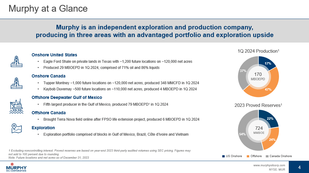 3 www.murphyoilcorp.com NYSE: MUR 3 Agenda 04 01 Murphy Exploration Murphy at a Glance 05 02 Looking Ahead Murphy Priorities 06 03 Appendix Murphy 2024 Plan