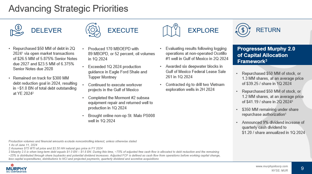 8 www.murphyoilcorp.com NYSE: MUR 8 What’s New in 2Q 2024 Share Repurchase 1 • Repurchased $50 MM of stock, or 1.2 MM shares, at an average price of $41.19 / share Debt Reduction 1 • Repurchased $50 MM of long - term debt via open market transactions • $26.5 MM of 5.875% Senior Notes due 2027 • $23.5 MM of 6.375% Senior Notes due 2028 Updated Exploration Expense Guidance • Revised 2Q 2024 exploration expense to $45 MM from $65 MM Maintaining Guidance Ranges • 2Q 2024 production 176 – 184 MBOEPD, 51% oil • FY 2024 production 180 – 188 MBOEPD, 52% oil • FY 2024 CAPEX $920 MM – $1.02 BN 1 As of June 11, 2024 Note: Production volumes and financial amounts exclude noncontrolling interest, unless otherwise stated
