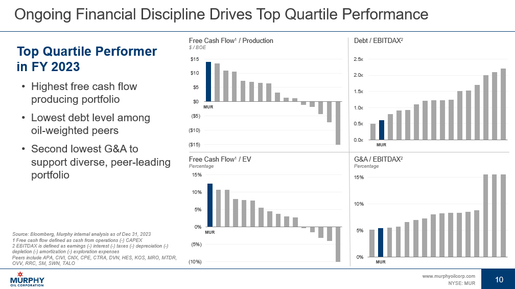 9 www.murphyoilcorp.com NYSE: MUR 9 • Repurchased $50 MM of debt in 2Q 2024 1 via open market transactions of $26.5 MM of 5.875% Senior Notes due 2027 and $23.5 MM of 6.375% Senior Notes due 2028 • Remained on track for $300 MM debt reduction goal in 2024, resulting in ~$1.0 BN of total debt outstanding at YE 2024 2 • Evaluating results following logging operations at non - operated Ocotillo #1 well in Gulf of Mexico in 2Q 2024 • Awarded six deepwater blocks in Gulf of Mexico Federal Lease Sale 261 in 1Q 2024 • Contracted rig to drill two Vietnam exploration wells in 2H 2024 • Produced 170 MBOEPD with 89 MBOPD, or 52 percent, oil volumes in 1Q 2024 • Exceeded 1Q 2024 production guidance in Eagle Ford Shale and Tupper Montney • Continued to execute workover projects in the Gulf of Mexico • Completed the Mormont #2 subsea equipment repair and returned well to production in 1Q 2024 • Brought online non - op St. Malo PS008 well in 1Q 2024 RETURN Advancing Strategic Priorities DELEVER EXECUTE EXPLORE Production volumes and financial amounts exclude noncontrolling interest, unless otherwise stated 1 As of June 11, 2024 2 Assumes $75 WTI oil price and $3.50 HH natural gas price in FY 2024 3 Murphy 2.0 is when long - term debt equals $1.0 BN – $1.8 BN. During this time, ~75% of adjusted free cash flow is allocated to debt reduction and the remaining ~25% is distributed through share buybacks and potential dividend increases. Adjusted FCF is defined as cash flow from operat ion s before working capital change, less capital expenditures, distributions to NCI and projected payments, quarterly dividend and accretive acquisitions Progressed Murphy 2.0 of Capital Allocation Framework 3 • Repurchased $50 MM of stock, or 1.3 MM shares, at an average price of $39.25 / share in 1Q 2024 • Repurchased $50 MM of stock, or 1.2 MM shares, at an average price of $41.19 / share in 2Q 2024 3 • $350 MM remaining under share repurchase authorization 1 • Announced 9% dividend increase of quarterly cash dividend to $1.20 / share annualized in 1Q 2024