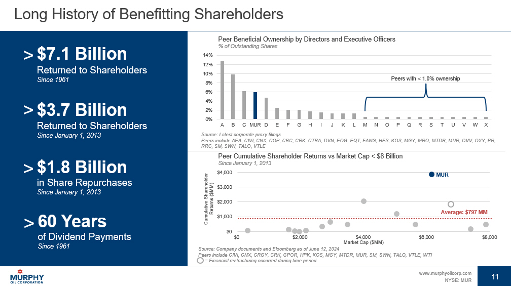 10 www.murphyoilcorp.com NYSE: MUR 10 Ongoing Financial Discipline Drives Top Quartile Performance Top Quartile Performer in FY 2023 • Highest free cash flow producing portfolio • Lowest debt level among oil - weighted peers • Second lowest G&A to support diverse, peer - leading portfolio Free Cash Flow 1 / Production $ / BOE Source: Bloomberg, Murphy internal analysis as of Dec 31, 2023 1 Free cash flow defined as cash from operations ( - ) CAPEX 2 EBITDAX is defined as earnings ( - ) interest ( - ) taxes ( - ) depreciation ( - ) depletion ( - ) amortization ( - ) exploration expenses Peers include APA, CIVI, CNX, CPE, CTRA, DVN, HES, KOS, MRO, MTDR, OVV, RRC, SM, SWN, TALO ($15) ($10) ($5) $0 $5 $10 $15 MUR 0.0x 0.5x 1.0x 1.5x 2.0x 2.5x MUR (10%) (5%) 0% 5% 10% 15% MUR 0% 5% 10% 15% MUR Free Cash Flow 1 / EV Percentage G&A / EBITDAX 2 Percentage Debt / EBITDAX 2