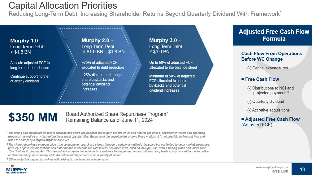 12 www.murphyoilcorp.com NYSE: MUR 12 Financial Results Targeting Lower Debt with Ample Liquidity Solid Foundation to Withstand Commodity Price Cycles • $1.1 BN of liquidity on Mar 31, 2024 • Includes $800 MM senior unsecured credit facility due Nov 2027 with no borrowings as of Mar 31, 2024 • Repurchased $50 MM of long - term debt via open market transactions in 2Q 2024 1 • $26.5 MM of 5.875% Senior Notes due 2027 • $23.5 MM of 6.375% Senior Notes due 2028 Long - Term Debt Profile 2 • Total senior notes outstanding: $1.3 BN • Weighted avg fixed coupon: 6.2% • Weighted avg maturity: 7.9 years • Next maturity Dec 2027 Positive Outlooks from Rating Agencies • Moody’s and Fitch revised outlooks to positive from stable • Corporate ratings of Ba2 / BB+ affirmed Total Debt Outstanding 3 $MM $0 $500 $1,000 $1,500 $2,000 $2,500 $3,000 $3,500 YE 2020 YE 2021 YE 2022 YE 2023 YE 2024E 1 As of June 11, 2024 2 As of March 31, 2024. Does not include $50 MM aggregate debt repurchases as of June 11, 2024 3 Assumes $75 WTI oil price and $3.50 HH natural gas price in FY 2024 Debt Maturity Profile 2 $MM $0 $250 $500 $750 $1,000 $1,250 Drawn RCF Undrawn RCF